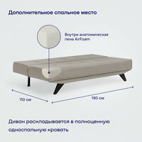 Оптимальная высота ножек позволит легко провести влажную уборку или же даст проехать стандартному роботу-пылесосу. Малогабаритный двухместный диван весит всего 37 кг, что делает его довольно мобильным и легким для передвижения и транспортировки, при этом каждое посадочное место выдерживает до 90 кг нагрузки. Удобная и легкая покупка: диван кровать доставляется одной коробкой. Максимально простая сборка - вам не потребуется специальных навыков и инструментов, достаточно прикрутить ножки. Инструкция в комплекте.