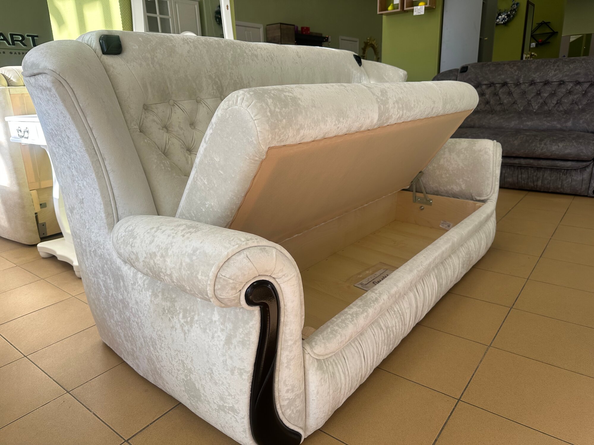 Диван оснащен ящиком для белья который легко открывается в форме сундука как в собранном виде дивана так и в разложенном это позволяет экономить пространство и поддерживать порядок. Мягкие подлокотники добавляют уют и комфорт при использовании.