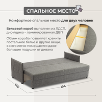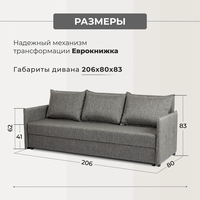 Прямой диван-кровать "Марсель" - это универсальная мебель, которая станет прекрасным дополнением интерьера вашего дома. Благодаря своему стильному дизайну и функциональности, этот диван подходит для разных помещений: от гостиной и спальни до детской комнаты и офиса. С его помощью вы сможете создать уютные зоны отдыха в разных частях вашего дома. Большой размер дивана позволяет разместить его в просторных залах или больших комнатах. Так же диванчик отлично впишется в интерьер дачи или офиса. Он может быть идеальным местом для отдыха семьи или друзей, а также дополнительным спальным местом для гостей. Кроме того, диван обладает мягким сиденьем и удобными подлокотниками, что обеспечивает комфорт во время использования. Диван кровать представлен в износостойкой ткане рогожка. Стильный дизайн делает этот диван прекрасным выбором для любого интерьера. Он подойдет как для современного дизайна, так и для классического или лофт стилей. Вы также можете разместить его на балконе, лоджии или в офисе, чтобы создать уютную зону отдыха или ресепшен для посетителей. Диван изготовлен из высококачественных материалов, включая фанеру и прочные ножки. Это гарантирует долгий срок службы мебели и ее надежность. Благодаря своей конструкции и удобному механизму трансформации - еврокнижка, диван также может использоваться как диван кровать, что делает его отличным выбором для небольших кабинетов или детских комнат. Размеры в собранном видк (ШхГхВ) 206х80х83 см. Спальное место: (ШхГ) 130х194 см. Конструкция дивана с большим запасом прочности и выдерживает не менее 100 кг на посадочное одно место. Также диван имеет просторный ящик для хранения белья, его размеры (ДхШхВ) 195х54х26,5 см.