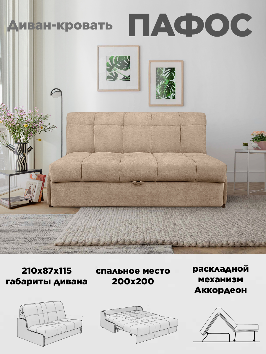 Диван кровать Пафос (бежевый) для отдыха и сна, механизм аккордеон, без подлокотников, велюр, 200х200 см: сравнение цен, характеристики, фото, актуальное наличие и цены.
