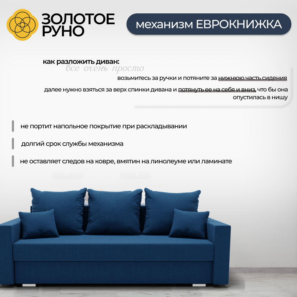 Диван-кровать "Олимп 1" оснащен простым механизмом трансформации "еврокнижка", что обеспечивает удобство и надежность в использовании.