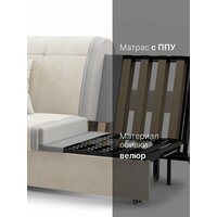 Обивка дивана выполнена из качественного велюра бежевого цвета, который придает изделию элегантный и современный вид. Материал обивки долговечен и прост в уходе, что обеспечивает долгий срок службы дивана.