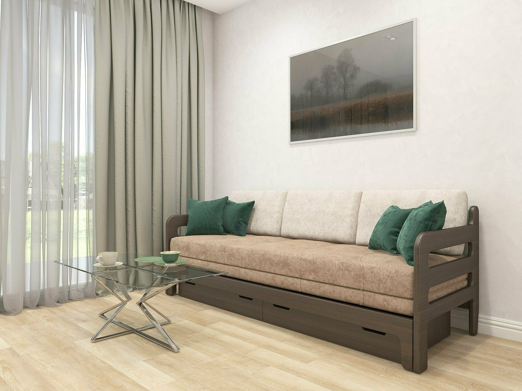 Диван- кровать Форвард с механизмом трансформации Софа. Полноценное спальное место размером - 1,4х2 метра. Наполнитель ППУ. Высота ножек позволяет легко проводить уборку, как обычными инструментами, так и роботом-пылесосом. Диван имеет съемные подушки и матрас. Подушки с замком - легко снять и постирать. Простой в уходе - прекрасно впишется в интерьер как дома, так и в роли летней уличной мебели. Поставьте в гостинную, на террасу, в детскую, на дачу или летний домик. Натуральный массив сосны безопасен и экологичен. Крепкий и лёгкий в сборке.
