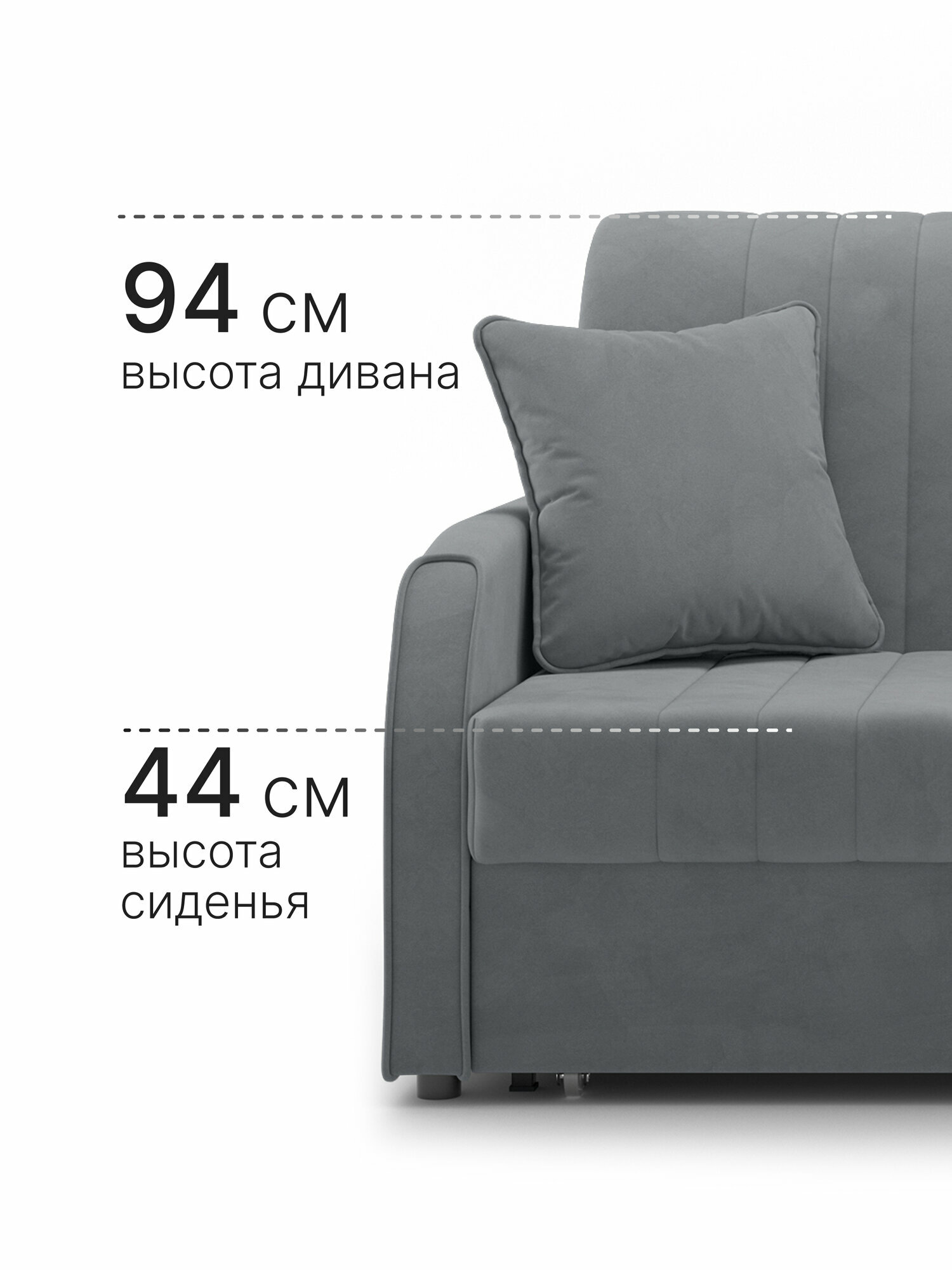Высота дивана составляет 94 см, глубина - 102 см, ширина - 174 см. Глубина сиденья - 60 см, максимальная нагрузка - 150 кг.