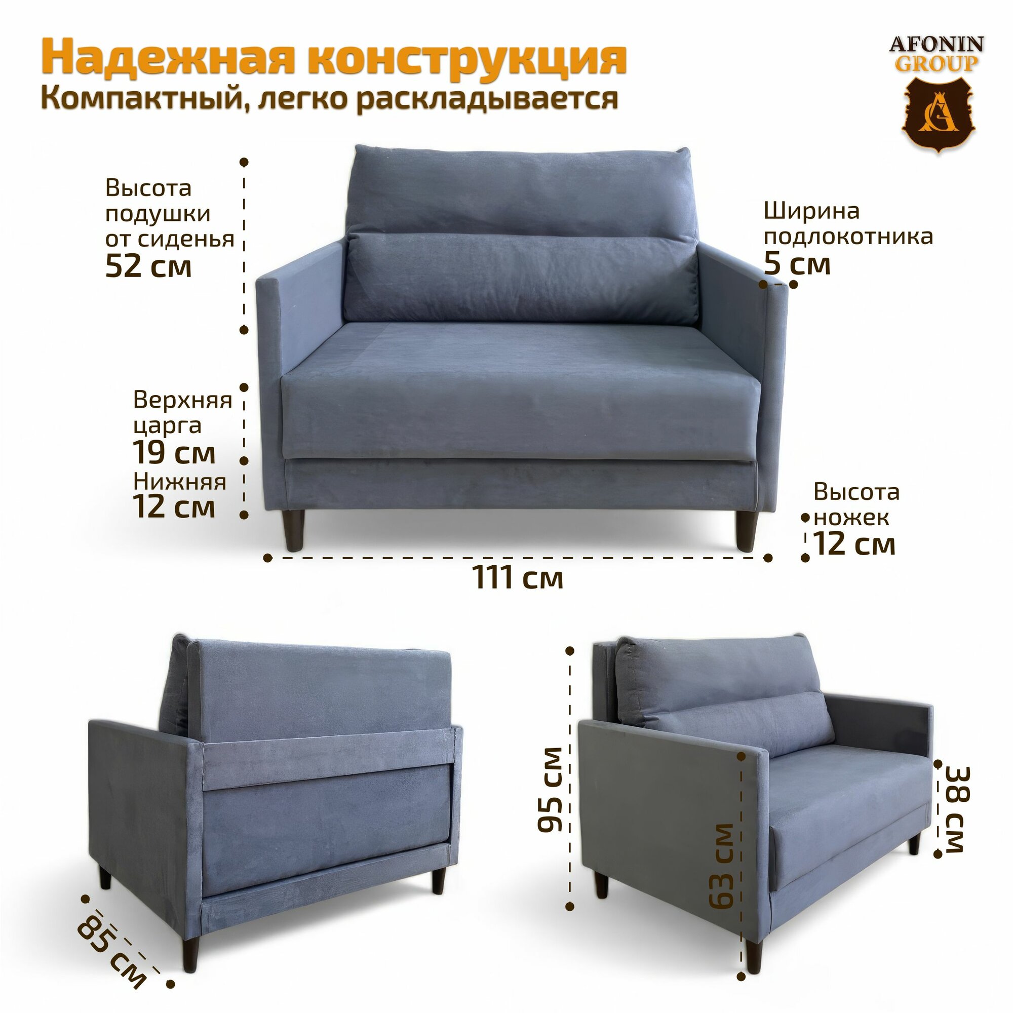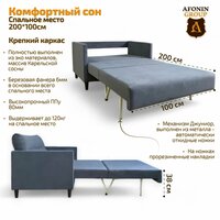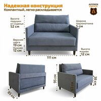 Небольшой, удобный диван со спальным местом средней жесткости не займет много места. Габариты в собранном виде (ШхГхВ): 111х85х95 см, спальное место 100х200 см подходит для ежедневного сна.