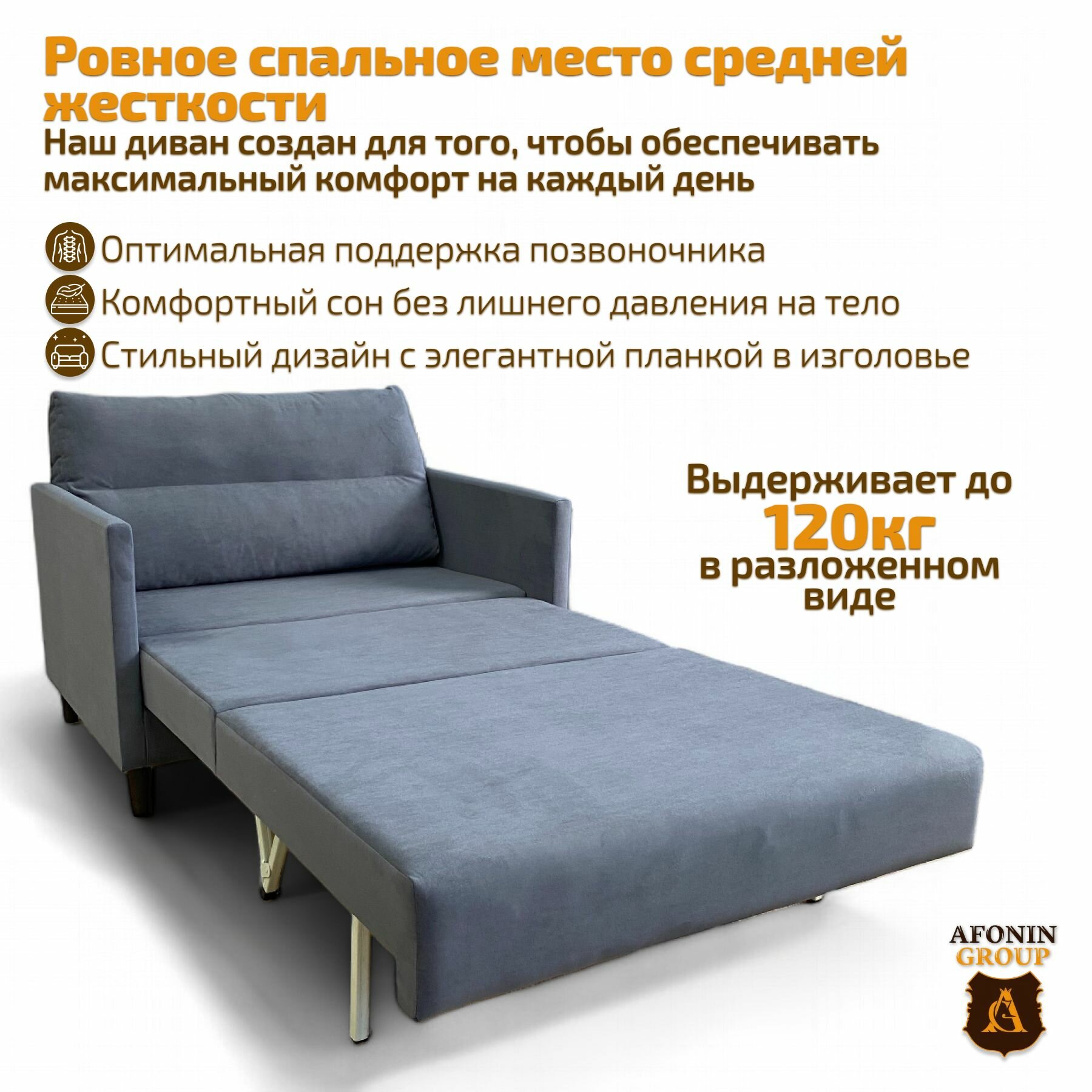 Каркас дивана выполнен из массива сосны, в основании сиденья и всего спального места настил из фанеры 10 мм и ППУ марки SТ толщиной 80 мм. Подушка со съемным чехлом в комплекте.