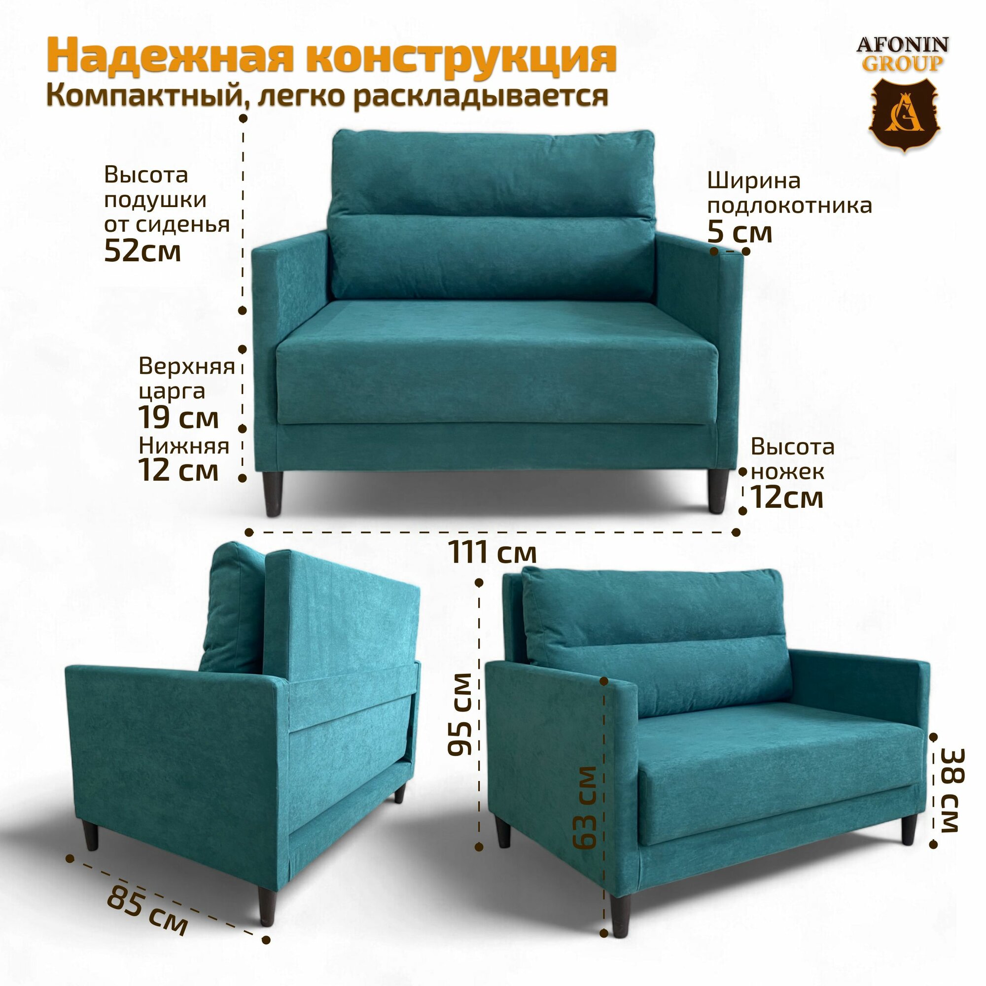 Небольшой, удобный диван со спальным местом средней жесткости не займет много места. Габариты в собранном виде (ШхГхВ): 111х85х95 см, спальное место 100х200 см подходит для ежедневного сна.