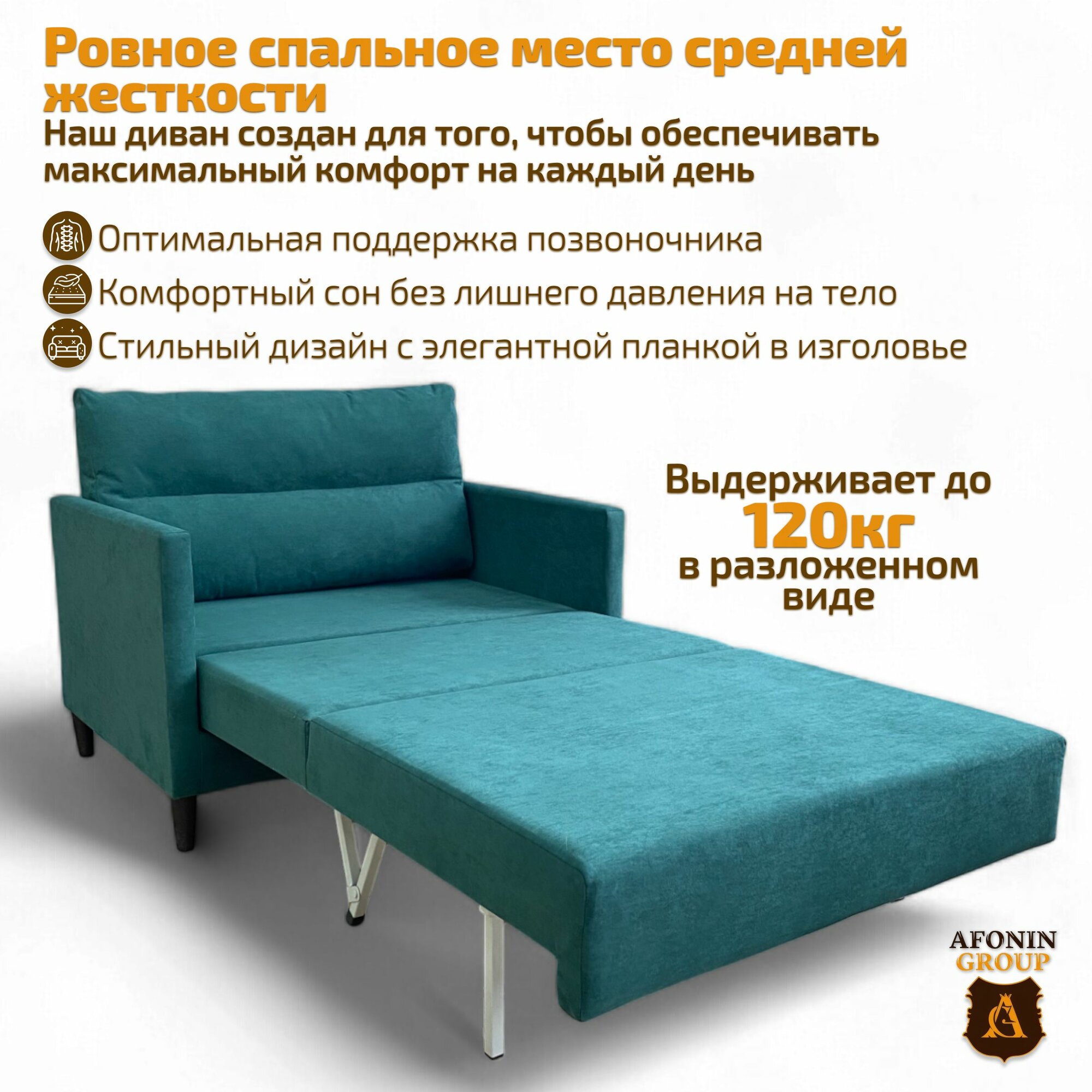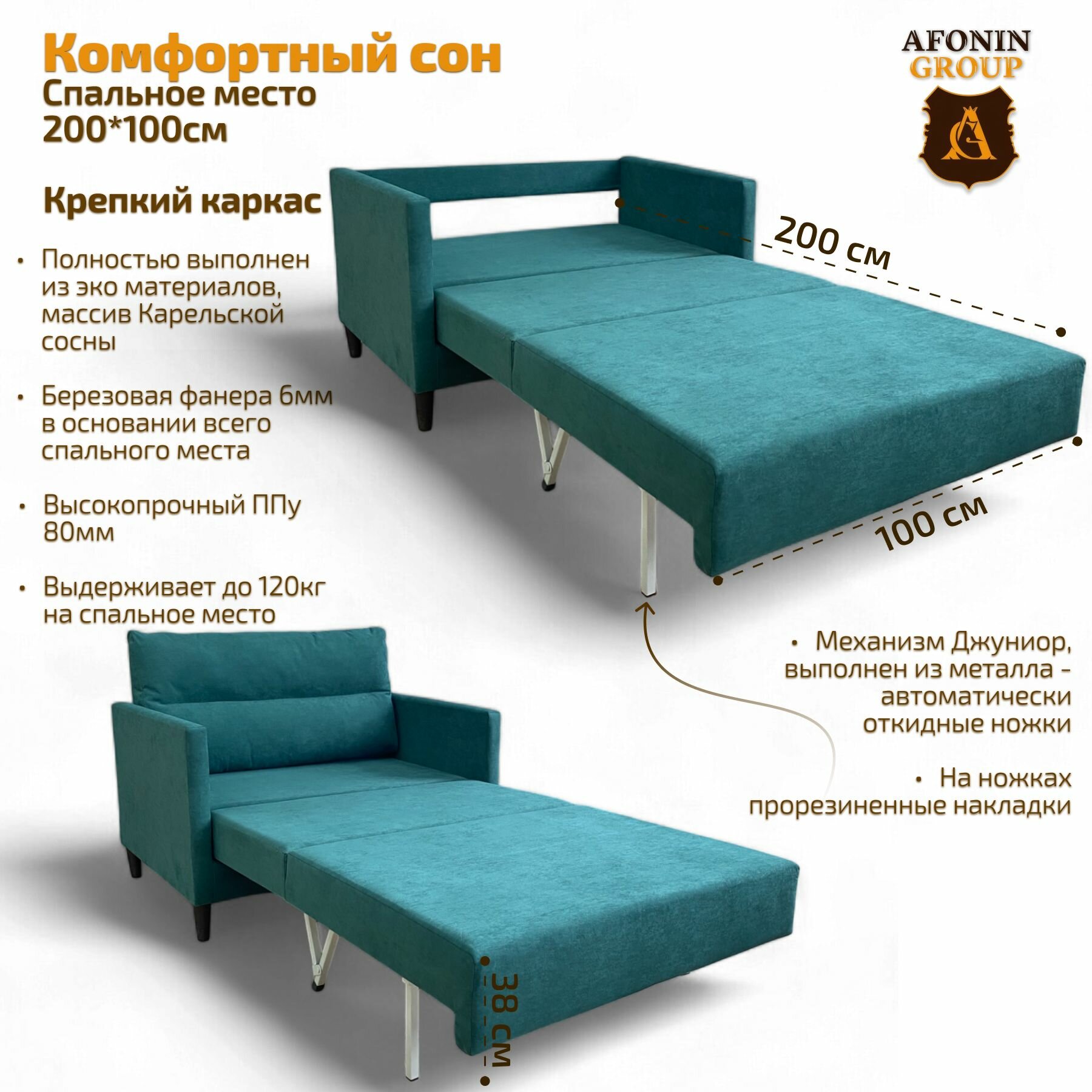 Каркас дивана выполнен из массива сосны, в основании сиденья и всего спального места настил из фанеры 10 мм и ППУ марки SТ толщиной 80 мм. Подушка со съемным чехлом в комплекте.