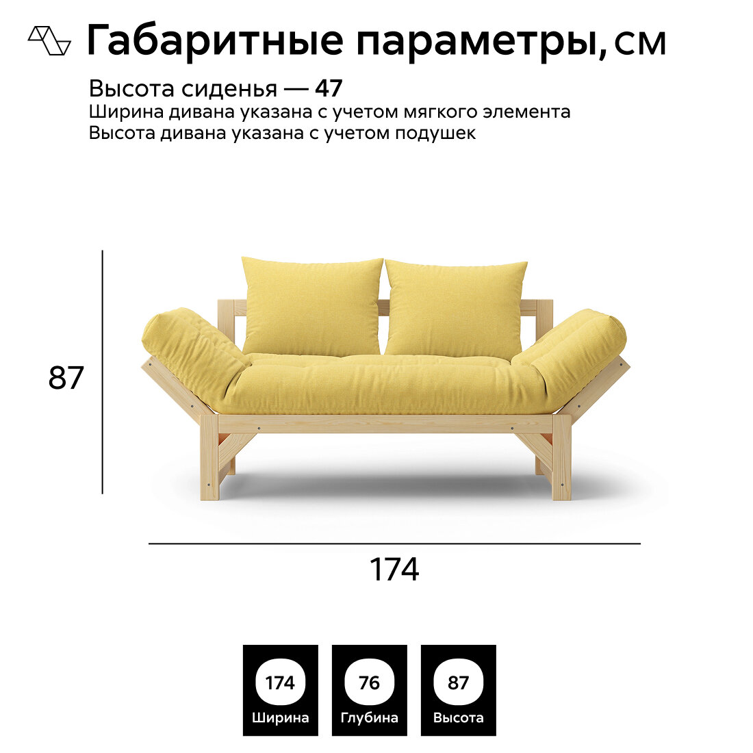 Матрас и приспинные подушки входят в комплект, обеспечивая дополнительный комфорт. Высота сиденья составляет 47 см, ширина дивана указана с учетом мягкого элемента, а высота дивана указана с учетом подушек.