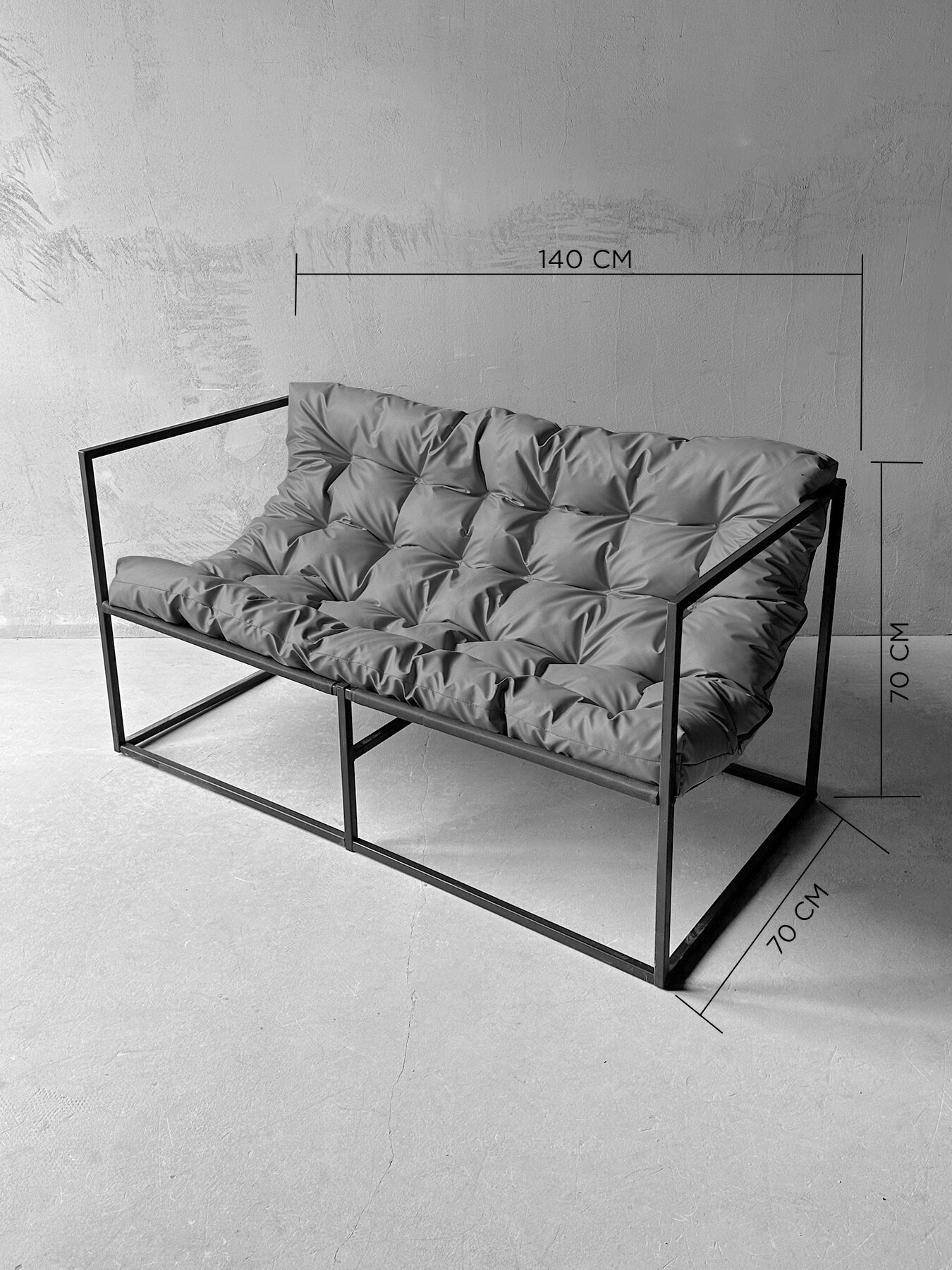 Диван "Лофтовик" имеет следующие размеры: длина - 140 см, высота - 70 см, ширина - 70 см. Максимальная нагрузка составляет 120 кг.