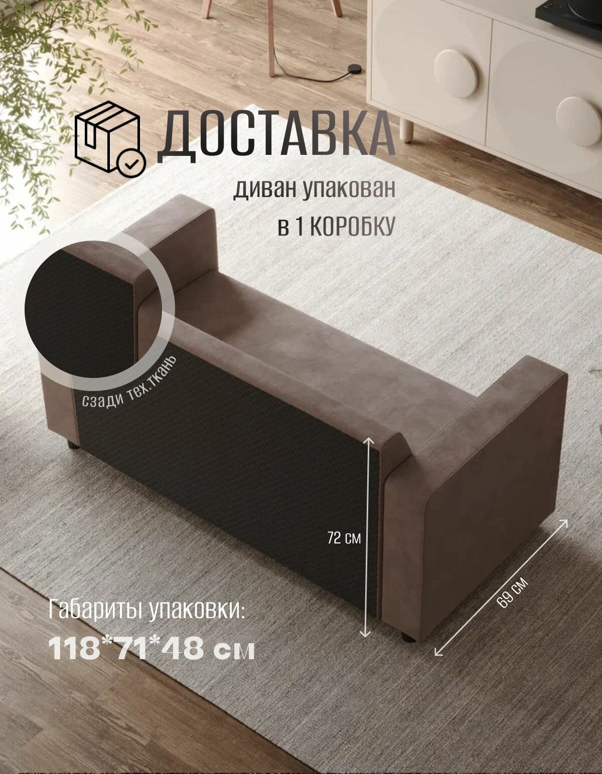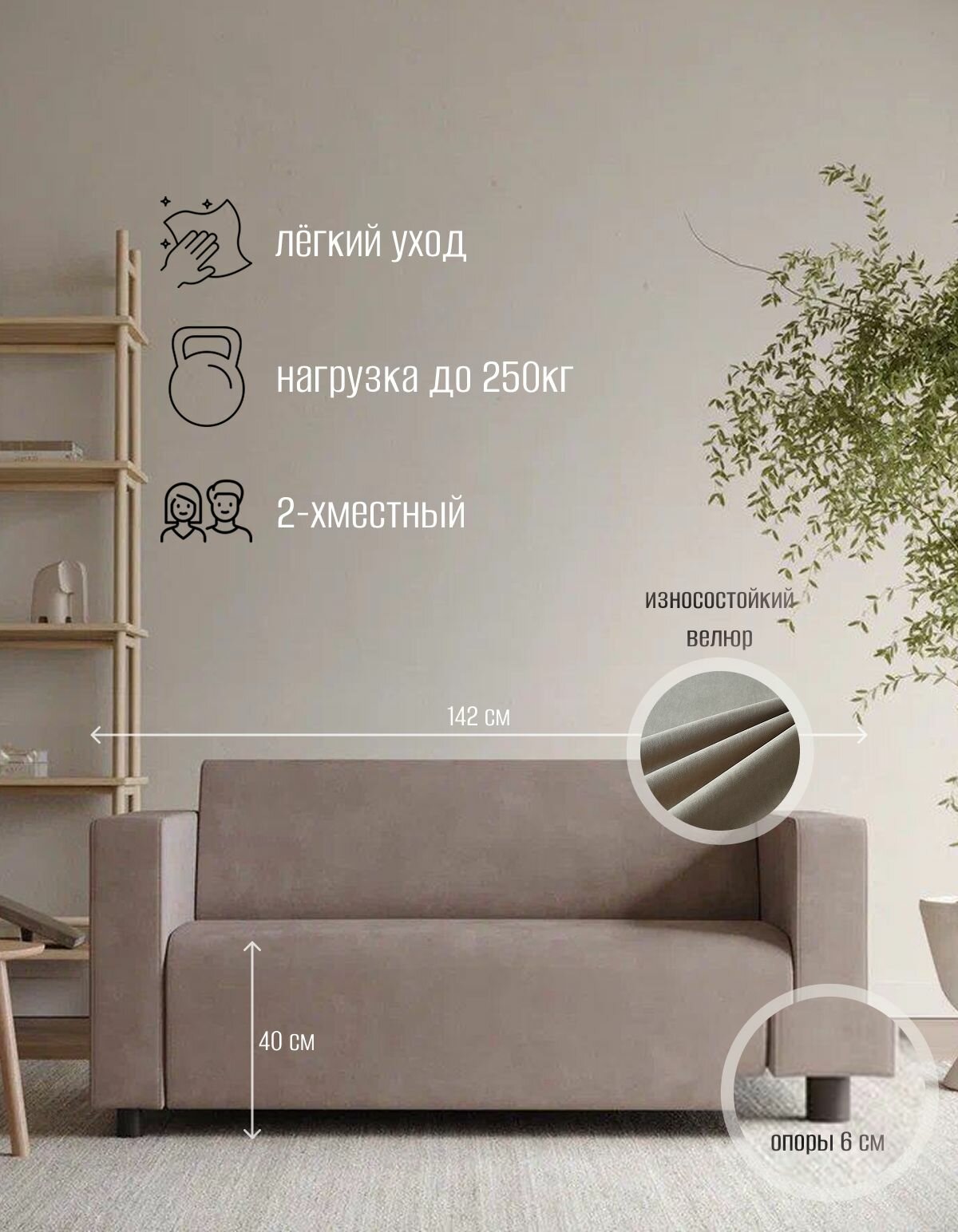 Габариты дивана составляют 142 см в длину, 69 см в ширину и 72 см в высоту. Высота посадочного места составляет 40 см, а размер посадочного места - 50х115 см.