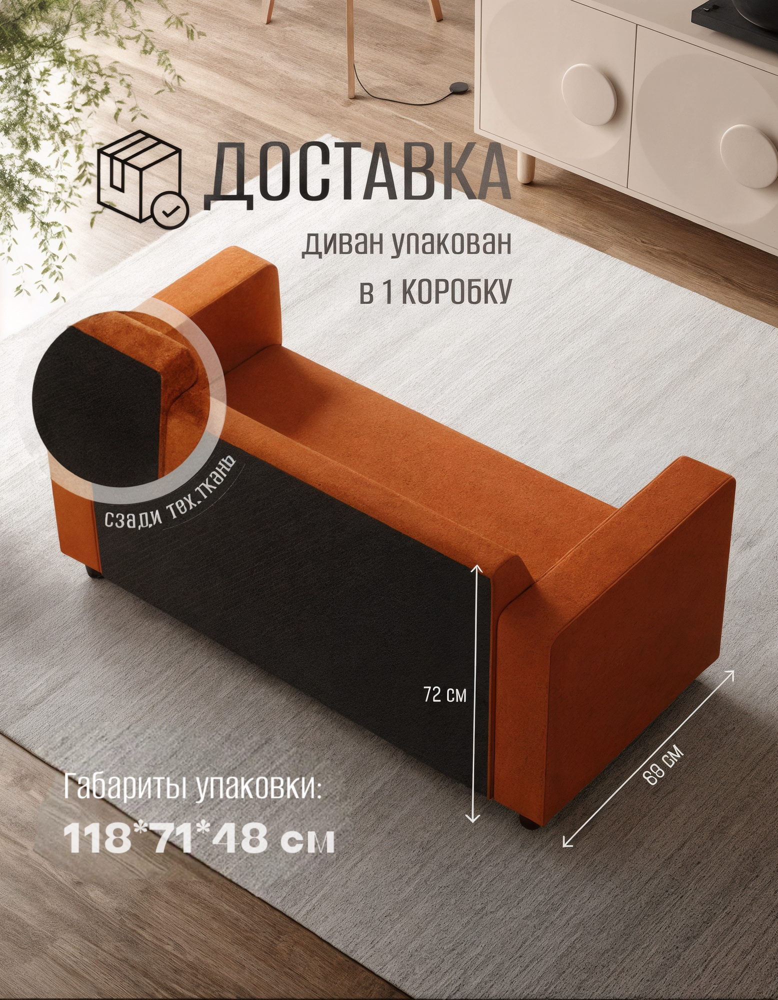 Каркас дивана выполнен из фанеры, ДВП и бруса, что обеспечивает его прочность и долговечность. Наполнитель из синтепона и пенополиуретана гарантирует комфорт и мягкость при использовании.