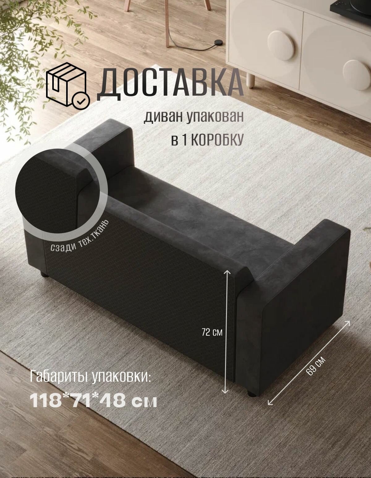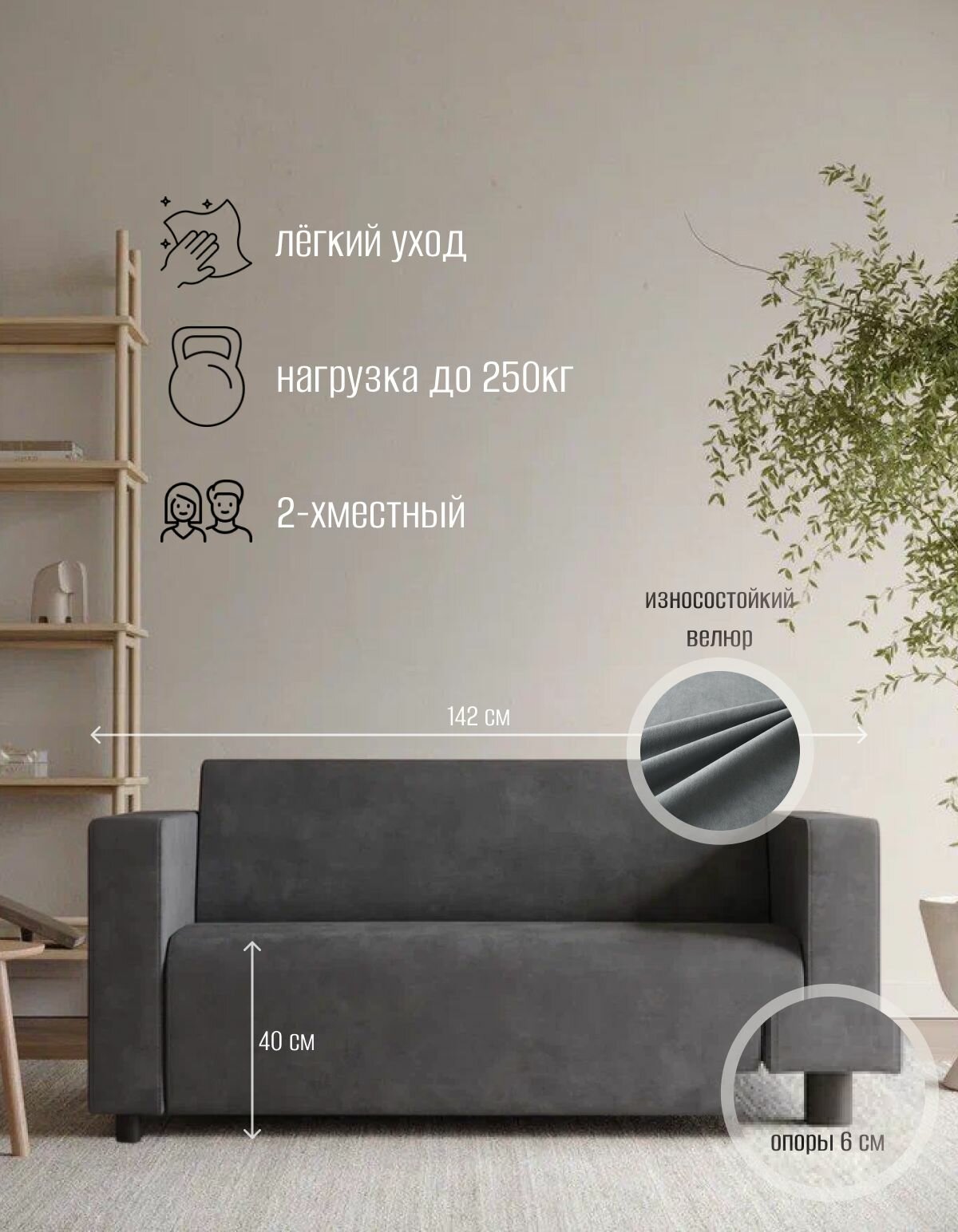 Габариты дивана составляют 142 см в длину, 69 см в ширину и 72 см в высоту. Высота посадочного места составляет 40 см, а размер посадочного места - 50х115 см.