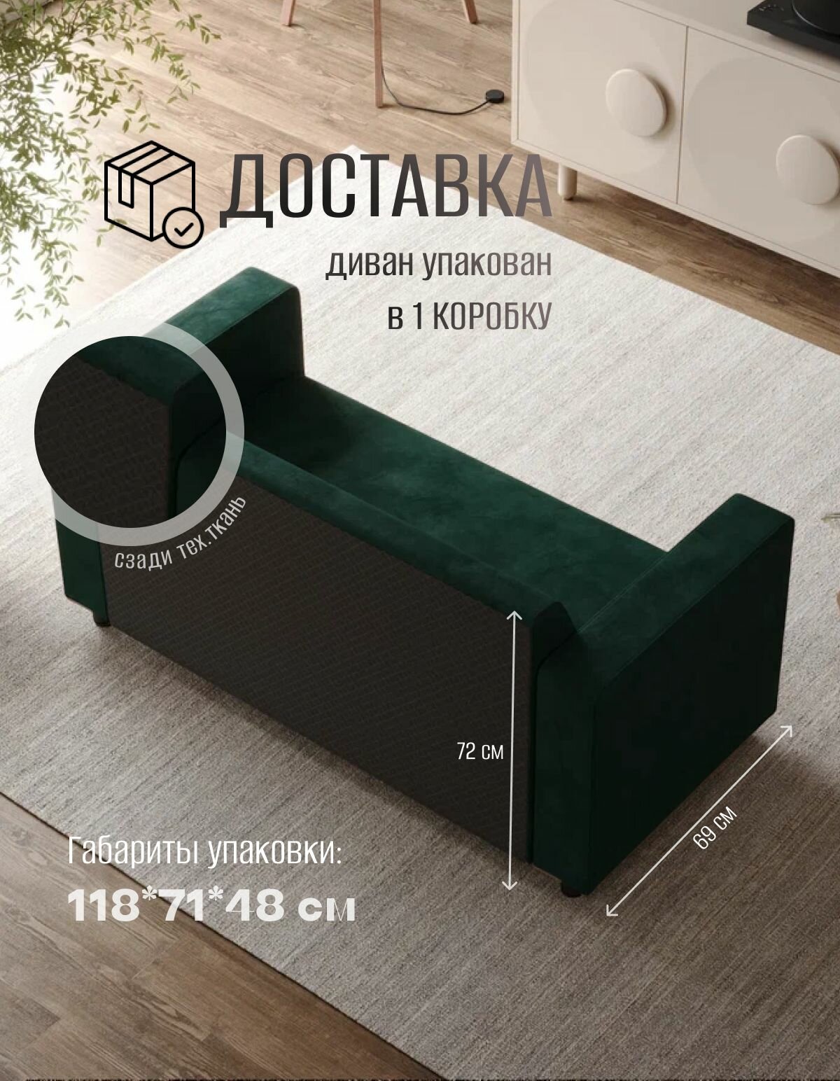 Каркас дивана выполнен из фанеры, ДВП и бруса, что обеспечивает его прочность и долговечность. Наполнитель из синтепона и пенополиуретана гарантирует комфорт и мягкость при использовании.