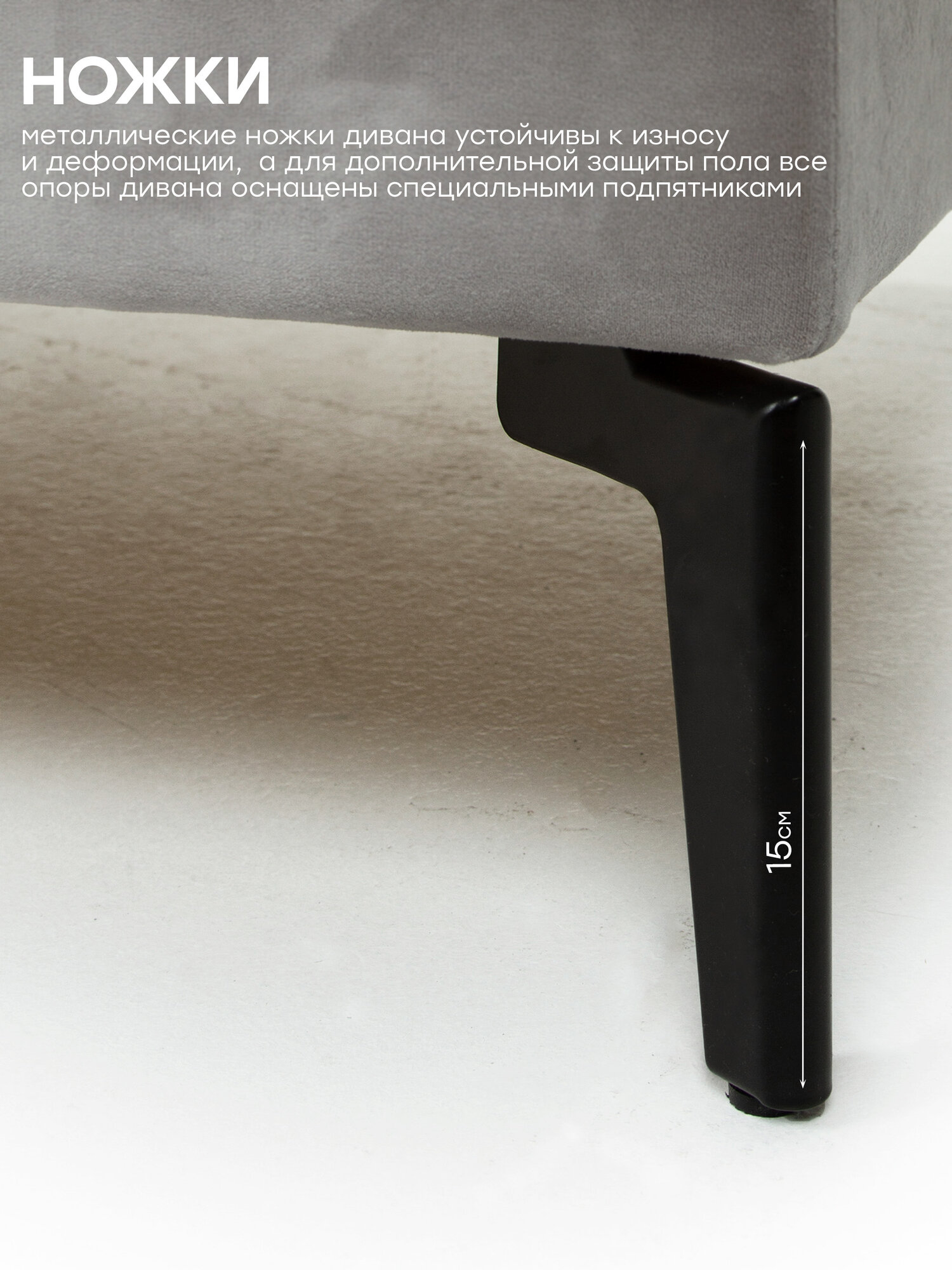 Диван выполнен в стиле лофт, минимализм и современный, что позволяет ему гармонично вписаться в любой интерьер. Обивка из антивандального велюра обеспечивает долговечность и легкость в уходе.