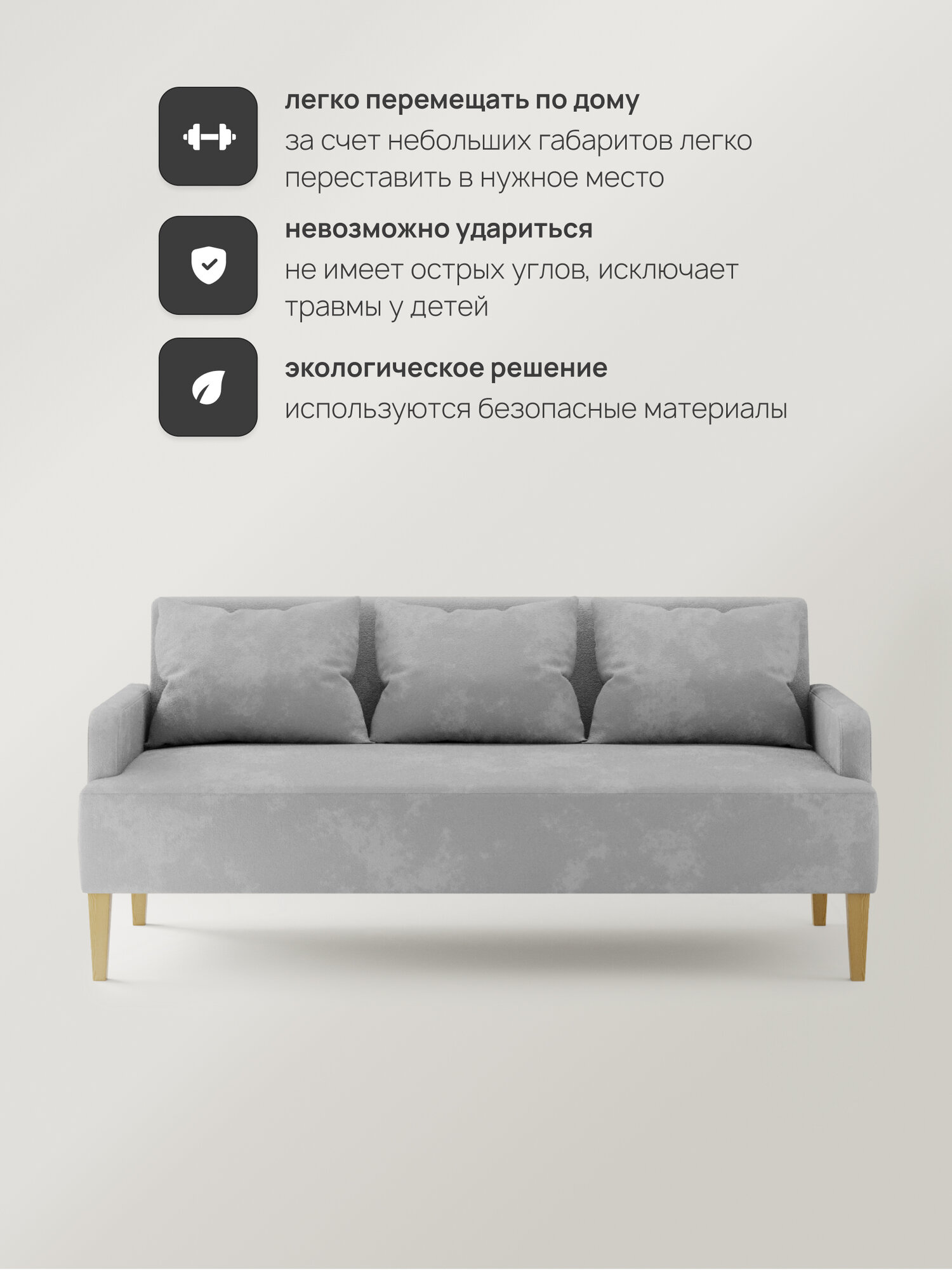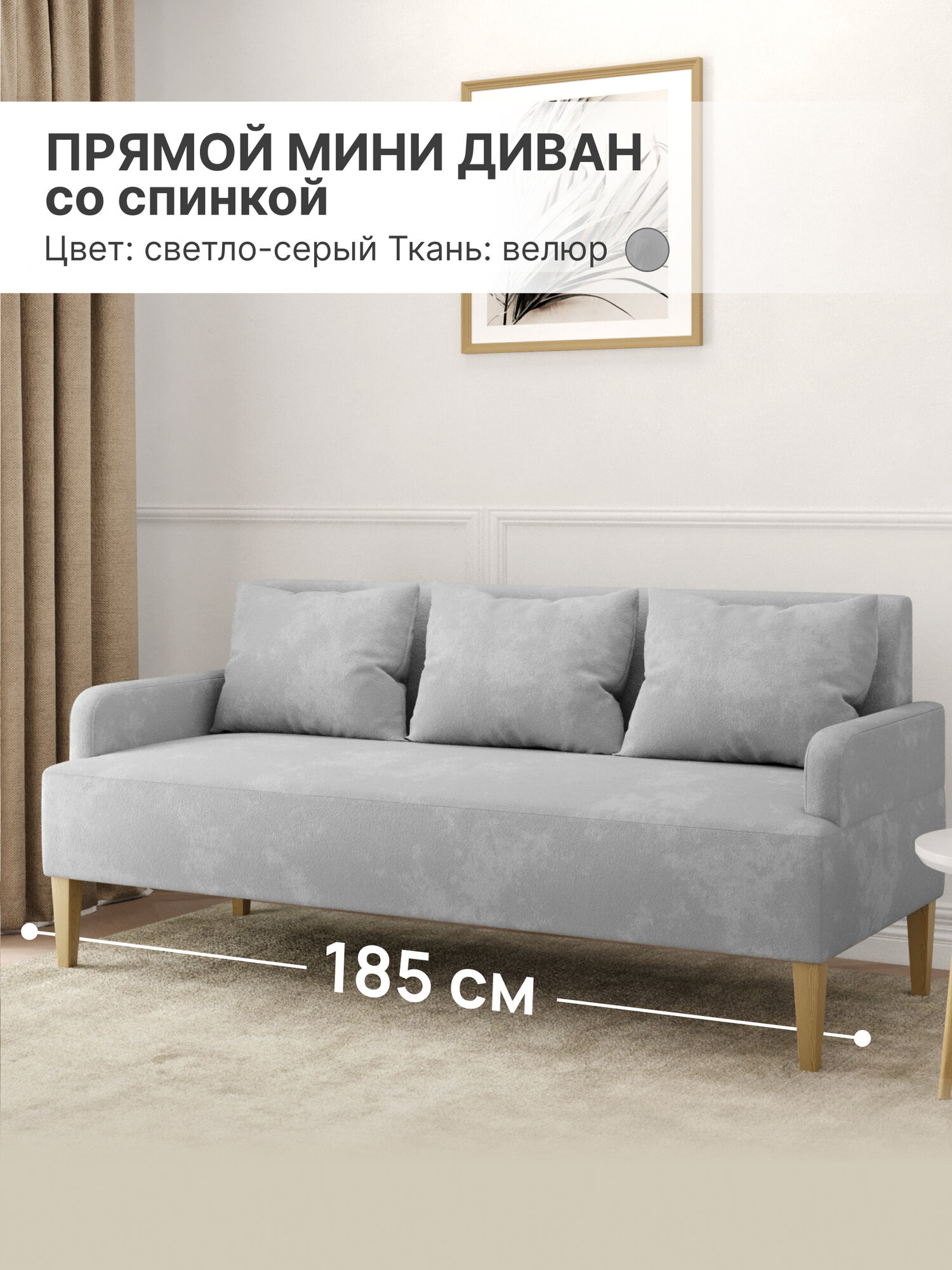 Диван прямой трехместный с подлокотниками, Велюр, Светло-серый, ШхГхВ 185х75х80 см: сравнение цен, характеристики, фото, актуальное наличие и цены.