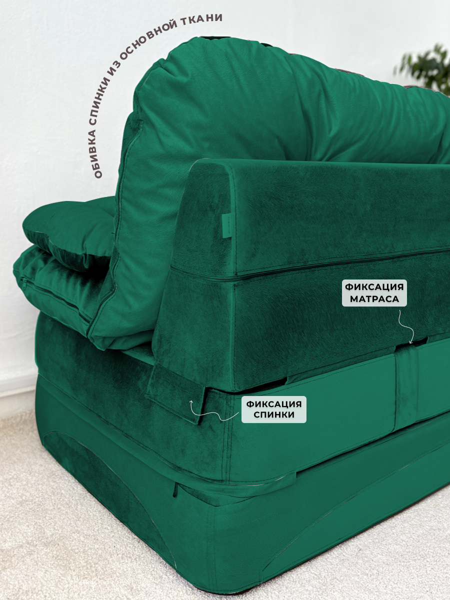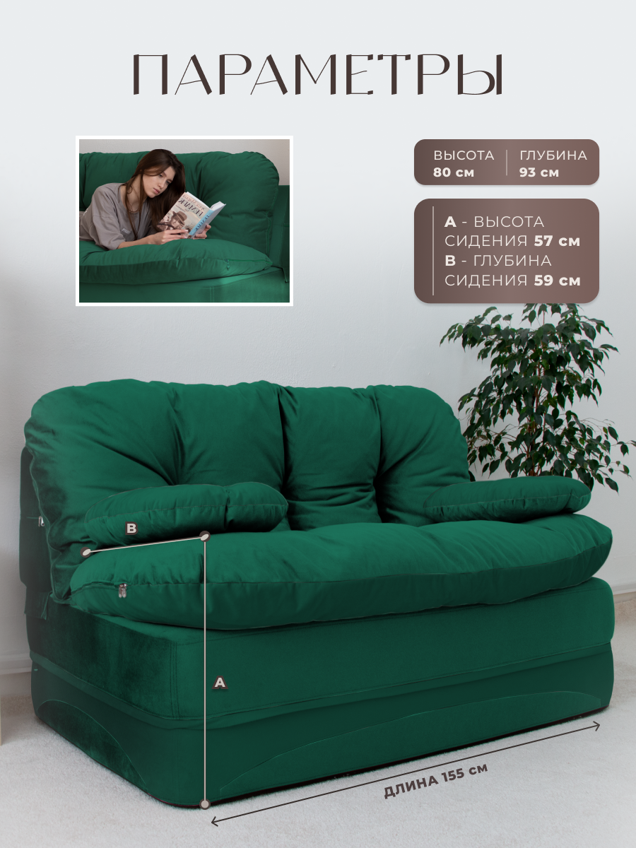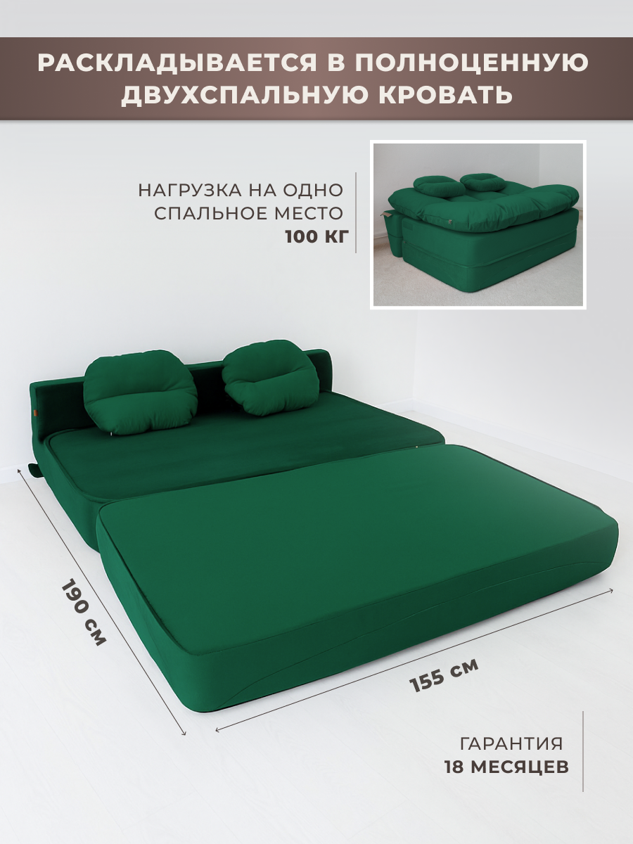 Купить Диван раскладной двухместный от Div-one 195*93 см, трансформер, бескаркасный, спальное место 155*190 см, зеленый с доставкой по всей России.