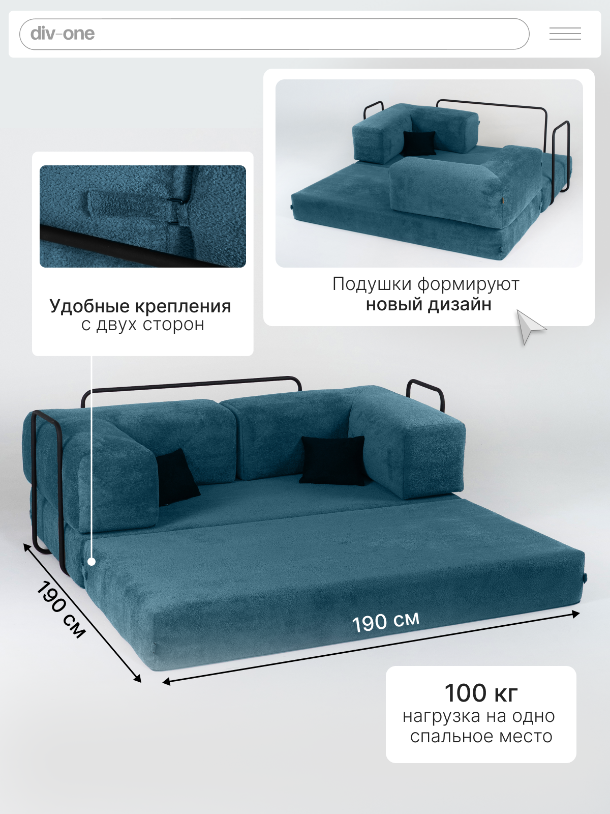 Купить Диван раскладной двухместный Реймонд, трансформер, бескаркасный, со спальным местом 190х190 см, бирюзовый с доставкой по всей России.