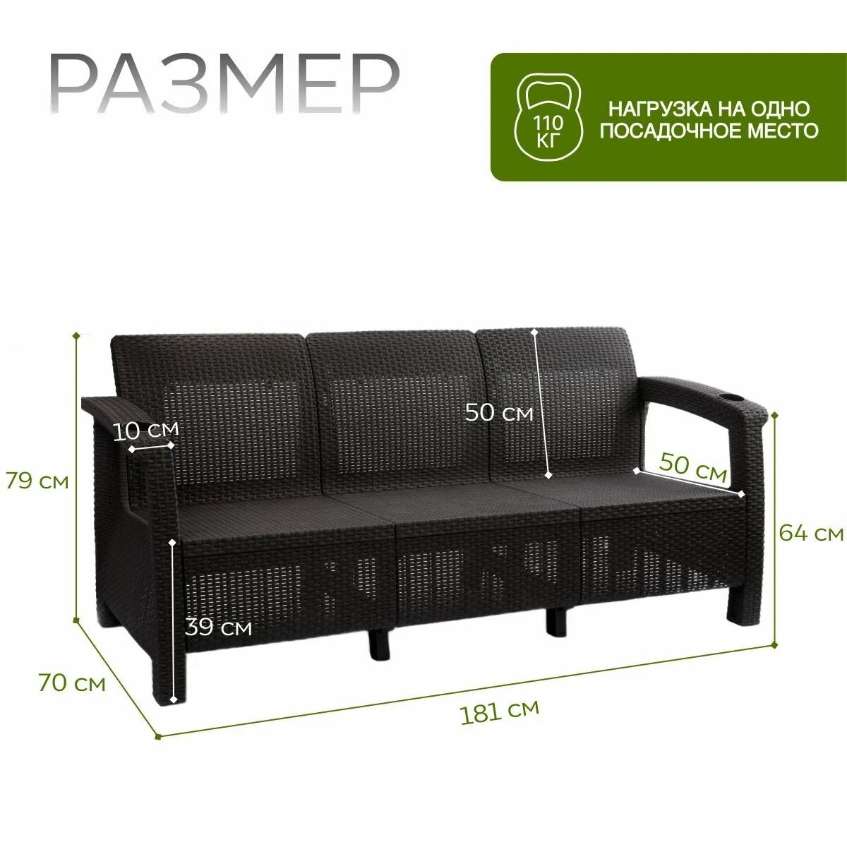 - Рассчитан диван на три человека, каждое посадочное место выдерживает вес до 110 кг.