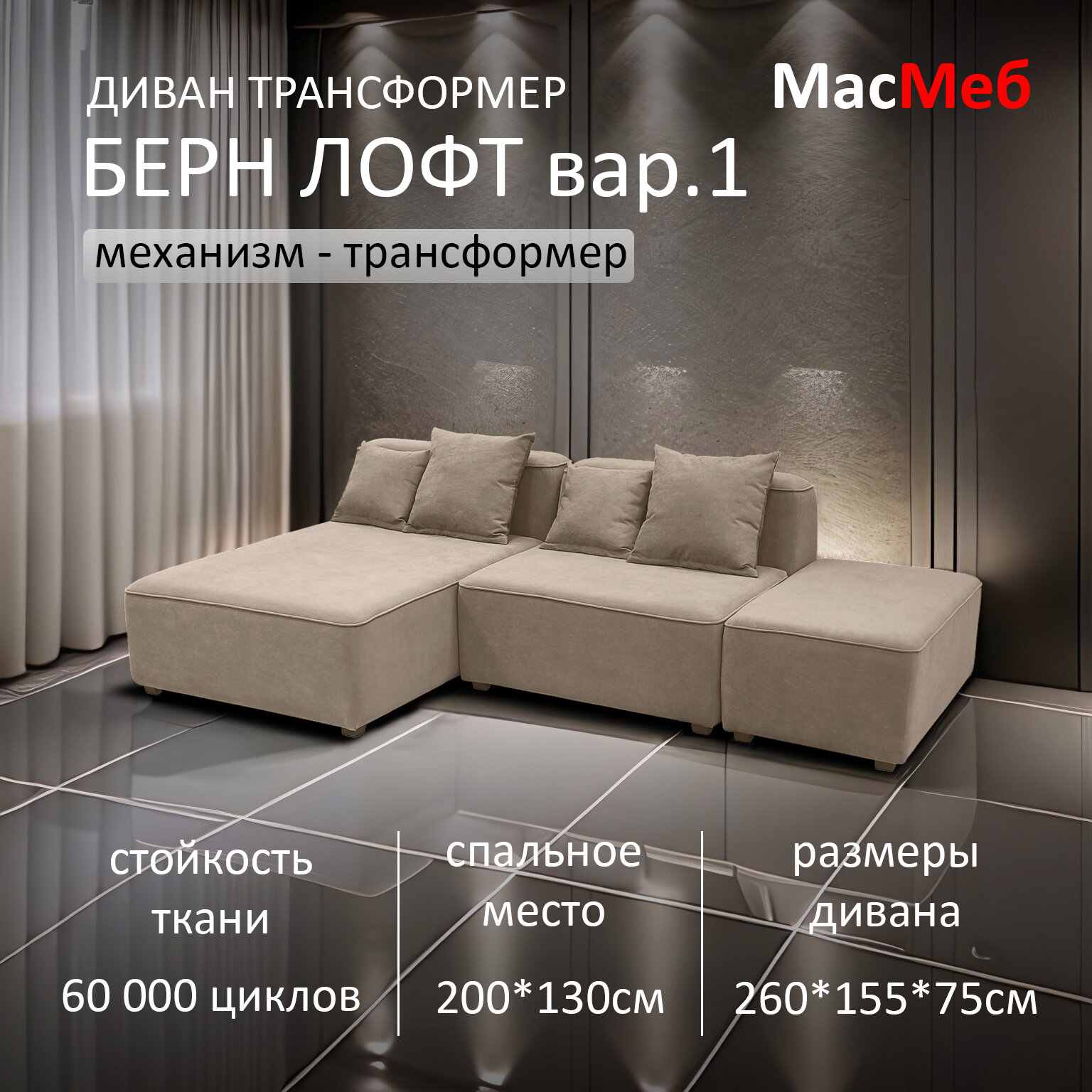 Купить Диван трансформер МасМеб Берн Лофт вариант 1, цвет бежевый, угол универсальный с доставкой по всей России.