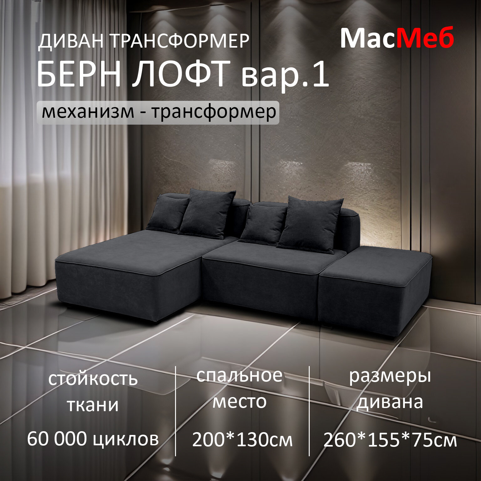 Диван трансформер МасМеб Берн Лофт вариант 1, цвет графит, угол универсальный: сравнение цен, характеристики, фото, актуальное наличие и цены.
