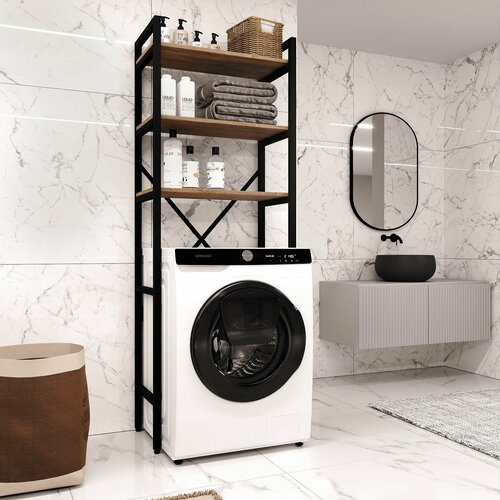 Стеллаж в ванную ARIEL ЛОФТ для стиральной машинки – это стильное и функциональное решение для организации пространства в ванной комнате или кухне. Изготовленный из металла и ЛДСП, он обладает высокой прочностью и долговечностью, а также привлекательным коричневым цветом Дуб Вотан ( Дуб Золотой, Наварра), который подчеркивает стиль лофт.