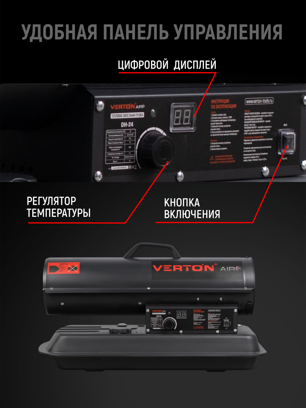 Купить Дизельная тепловая пушка Verton Air DH-24 (24кВт,588м3/ч,1,4л/ч, прям. нагрев, дисплей, манометр, дизель/керосин) с доставкой по всей России. Дизельная тепловая пушка Verton Air DH-24 (24кВт,588м3/ч,1,4л/ч, прям. нагрев, дисплей, манометр, дизель/керосин): сравнение цен, характеристики, фото, актуальное наличие и цены.