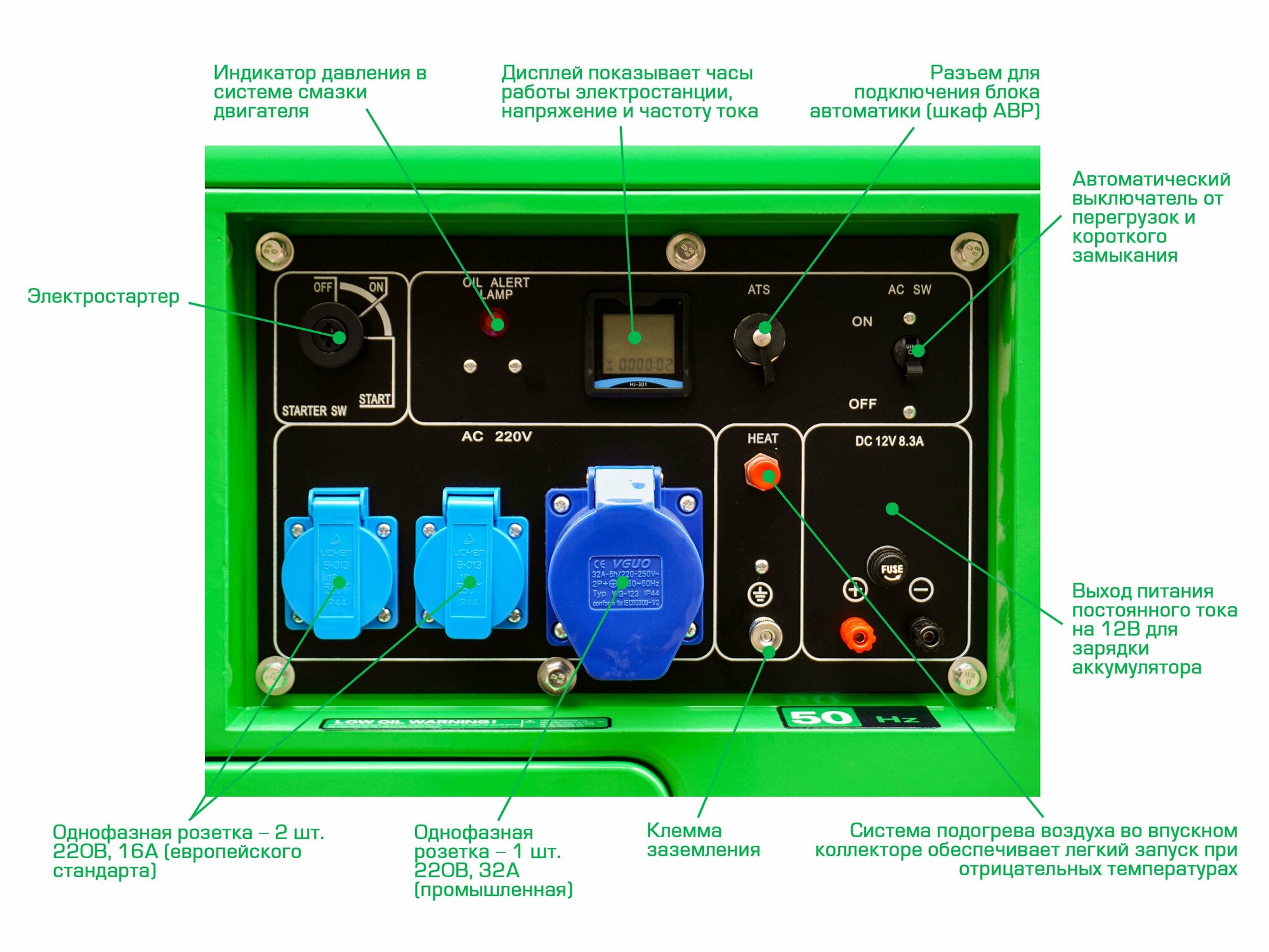 | Дополнительная информация | Комплектация: Дизельный генератор в кожухе, упакованный в пленку и в картонную коробку/деревянный поддон; Комплект колёс; Аккумулятор; Вилка электрическая 220В 16А - 2 шт.; 32А - 1 шт; Набор ключей; Инструкция по эксплуатации; Гарантийный талон; Шкаф автоматического ввода резерва (АВР) для одноцилиндровых дизельных двигателей. |