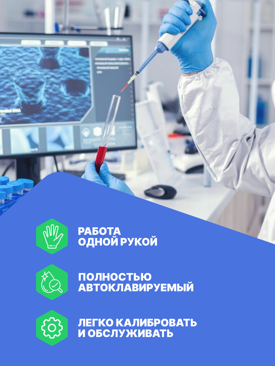 Цифровой дисплей обеспечивает хорошую видимость дозируемого объёма. Упор для пальца позволяет снизить нагрузку при выполнении однотипных монотонных движений кистью. Дозатор предназначен для точного отбора и дозирования объемов жидкости в лабораторной практике.