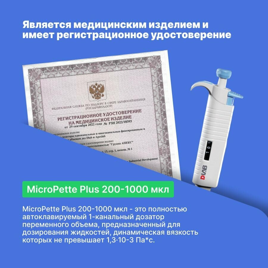 Купить DLAB MicroPette Plus 200-1000 мкл Дозатор переменного объема 1-канальный с Регистрационным Удостоверением с доставкой по всей России.