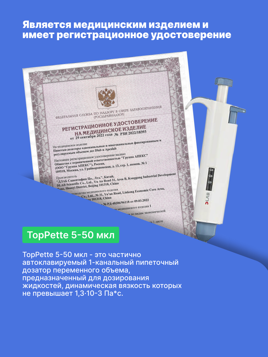 DLAB TopPette 5-50 мкл Дозатор переменного объема 1-канальный с Регистрационным Удостоверением: сравнение цен, характеристики, фото, актуальное наличие и цены.