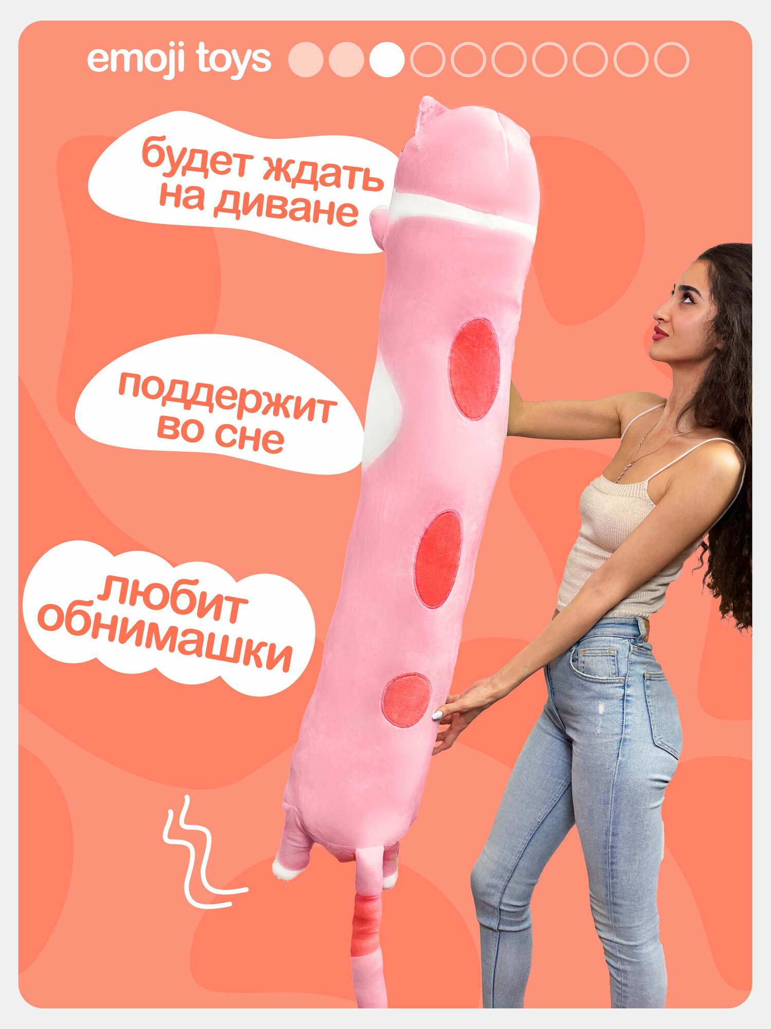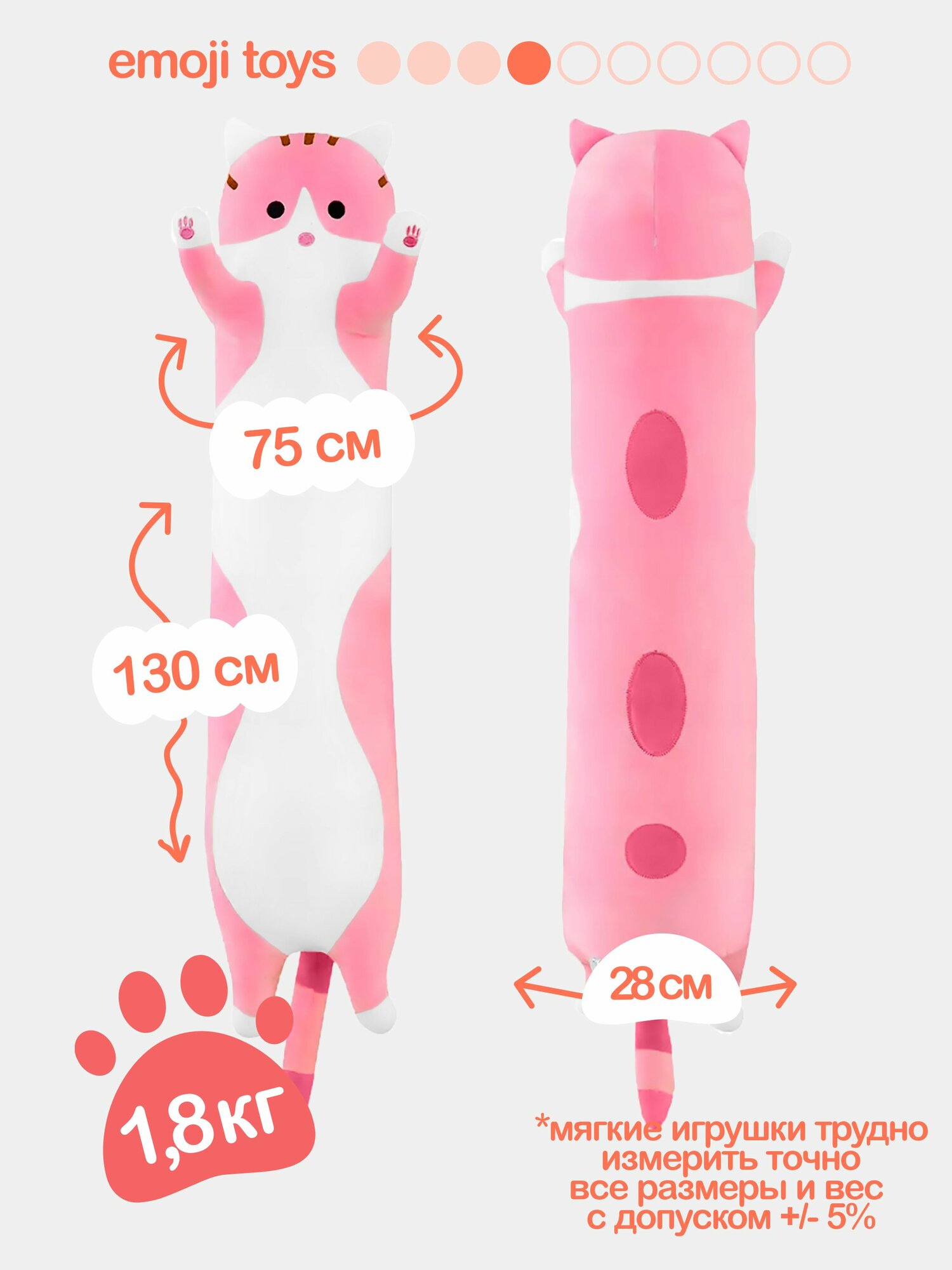 Длинная подушка розовый кот-сосиска — оригинальный подарок для детей и взрослых. Качественная плюшевая игрушка с гипоаллергенным наполнителем из холлофайбера и прочными швами. Идеально подходит как игрушка-антистресс, подушка-валик, игрушка для сна или интерьерный декор. Безопасна, сертифицирована, сделана с любовью.