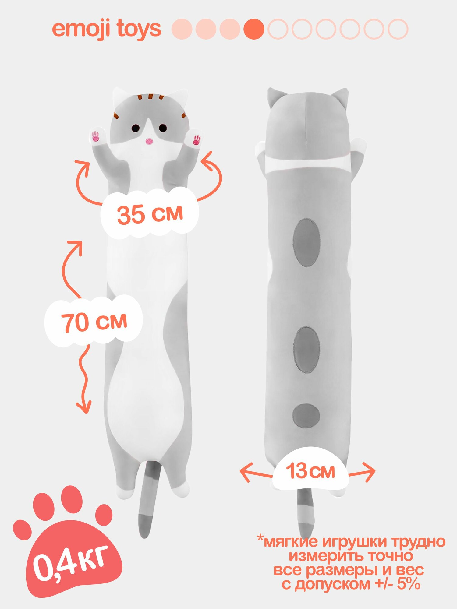 Длинная подушка серый кот-сосиска — оригинальный подарок для детей и взрослых. Качественная плюшевая игрушка с гипоаллергенным наполнителем из холлофайбера и прочными швами. Идеально подходит как игрушка-антистресс, подушка-валик, игрушка для сна или интерьерный декор. Безопасна, сертифицирована, сделана с любовью.