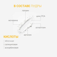 Энзимная пудра с кислотами содержит мощный комплекс активных компонентов: папаин, аллантоин, аргинин, яблочную, аскорбиновую и салициловую кислоты. Уже после первого применения вы заметите значительные улучшения: • Устранение сальных нитей • Сглаживание рельефа кожи • Удаление шелушений и накопленных загрязнений