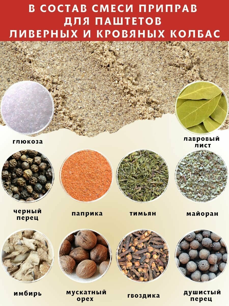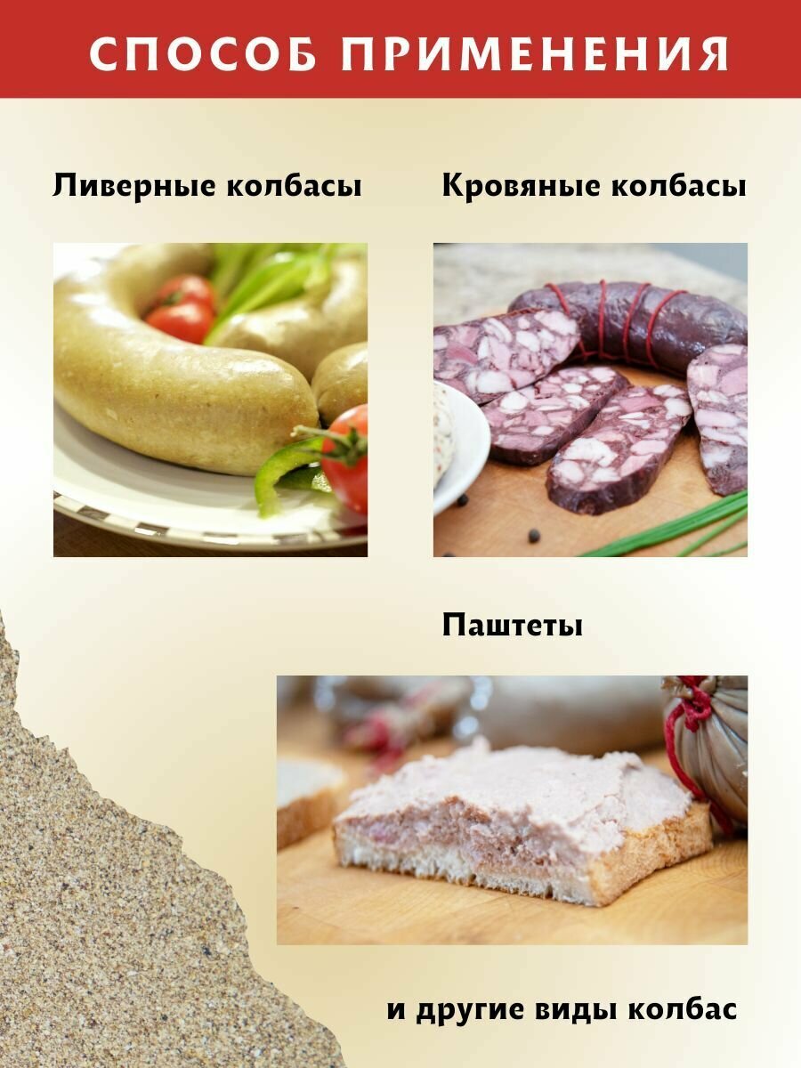 Универсальная приправа разработана как для паштетов, изготовляемых по холодной схеме, так и для паштетов, готовящихся по горячей схеме. Попробуйте приготовить с этим набором специй паштет печеночный, паштет куриный, паштет из индейки, паштет из дичи или даже постный паштет. И вы приятно удивитесь сочетанию специй и пряностей в готовом продукте. Также, эта смесь приправ подходит для: колбаса ливерная, колбаса докторская, мортаделла, сосиски, сардельки. Готовая смесь специй для колбасок состоит из натуральных приправ. Норма внесения: 8 -10 гр на один кг. мясного сырья.