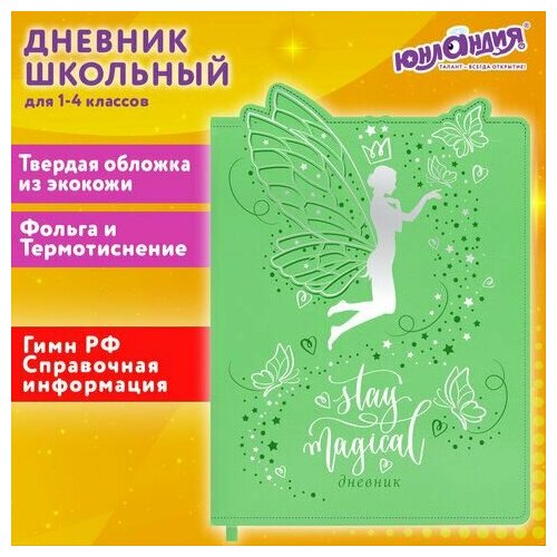 Предназначен для учащихся начальных классов. Твердая обложка из экокожи надежно защищает бумагу и долго сохраняет привлекательный внешний вид, а тиснение фольгой придает изделию оригинальность. Внутренний блок содержит 48 листов и состоит из офсетной белой бумаги плотностью 70 г/м2. В справочном материале собраны основные подсказки для учащихся. Для удобства пользования дневник снабжен закладкой-ляссе.