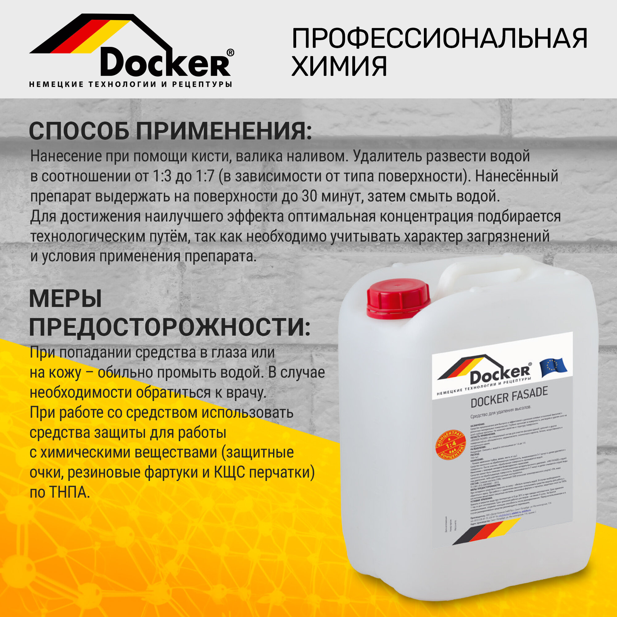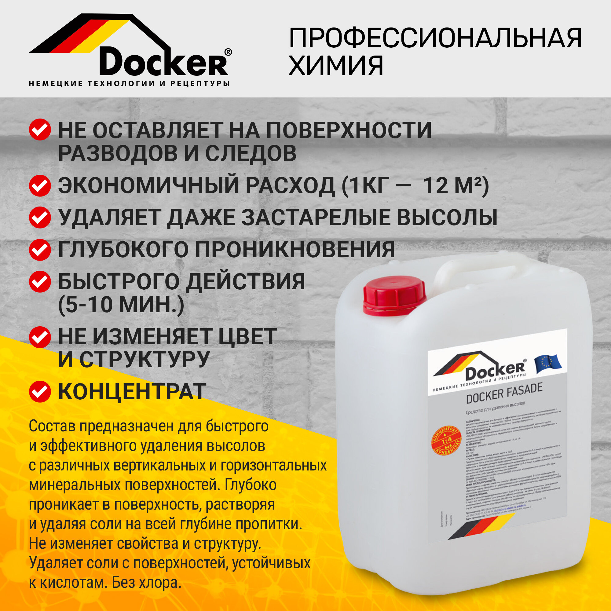 Купить DOCKER FASADE Концентрат 1:4 Cредство для удаления высолов (10 л.) с доставкой по всей России. DOCKER FASADE Концентрат 1:4 Cредство для удаления высолов (10 л.): сравнение цен, характеристики, фото, актуальное наличие и цены.