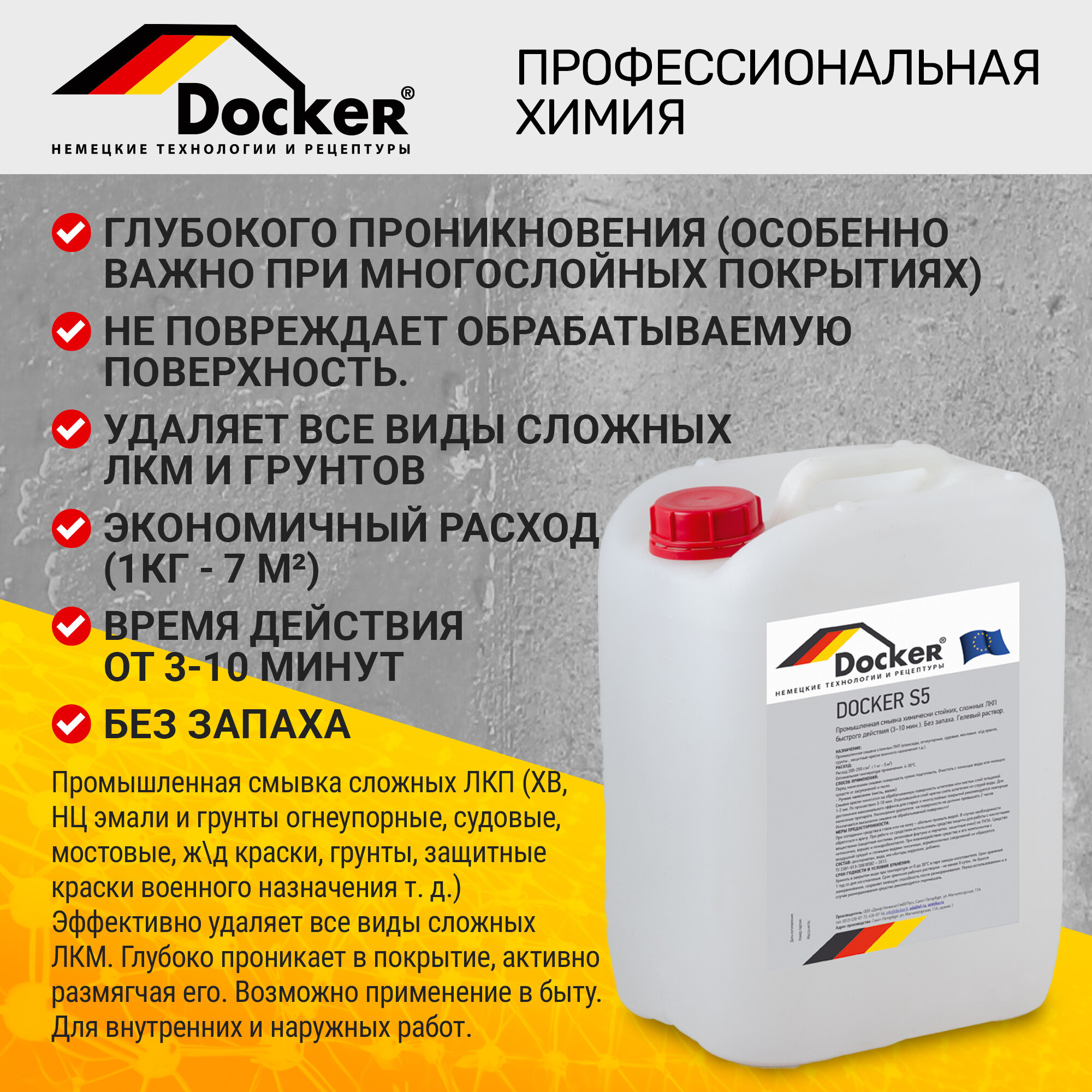 DOCKER S5 раствор без запаха. Смывка сложных ЛКМ, НЦ, ХВ, Грунты, Эмали. (5 кг).: сравнение цен, характеристики, фото, актуальное наличие и цены.