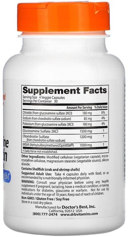 Препарат «Глюкозамин, хондроитин и МСМ» от Doctor's Best предоставляет 3 важных питательные вещества, которые способствуют сохранению здоровья суставов и соединительных тканей: глюкозамин, хондроитин и метилсульфонилметан (МСМ, из OptiMSM). Сульфат глюкозамина обеспечивает здоровье суставов, предоставляя им смазку, а также улучшая их подвижность и гибкость. Хрящи, сформированные из протеогликанов, в основном находятся в костях (рядом с суставами) и состоят преимущественно из протеина коллагена с боковыми связями, известными как хондроитин сульфаты. MSM поставляет организму биодоступную серу, необходимую для здоровья суставов, волос, кожи и ногтей. OptiMSM очищается путем дистилляции для достижения высочайшей чистоты и консистенции и является отличным источником биодоступной серы.
