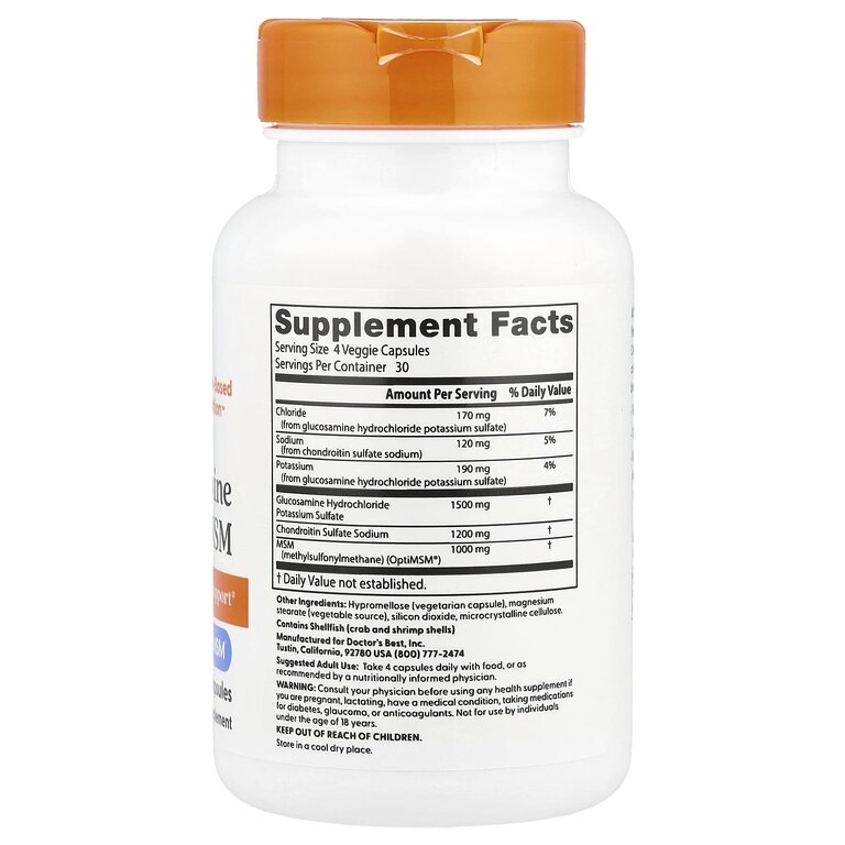 Препарат Glucosamine Chondroitin MSM with OptiMSM МСМ от Doctor's Best содержит три важных питательных вещества, которые помогают поддерживать здоровье суставов и соединительных тканей: глюкозамин, хондроитин и метилсульфонилметан. Сульфат глюкозамина способствует здоровью суставов: смазывает их, улучшает подвижность и гибкость. Хрящи, сформированные из протеогликанов, в основном находятся в костях (рядом с суставами) и состоят преимущественно из протеина коллагена с боковыми связями, известными как хондроитин сульфаты. МСМ поставляет биодоступную серу, необходимую для поддержания здоровья суставов, волос, кожи и ногтей. OptiMSM очищают путем дистилляции для достижения высочайшей степени чистоты и консистенции. Это отличный источник биодоступной серы.