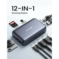 【Док-станция 12 в 1】 Раскройте непревзойденную универсальность с двумя портами 4K HDMI, 4K DP, USB-C 3.0 PD (100W), USB-C 3.0, входным портом USB-C, USB-A 3.0, USB-A 2.0, аудиоразъемом 3.5 мм, картридером SD/TF (5Gbps) и гигабитным Ethernet (1024Mbps) — все это в одной док-станции.