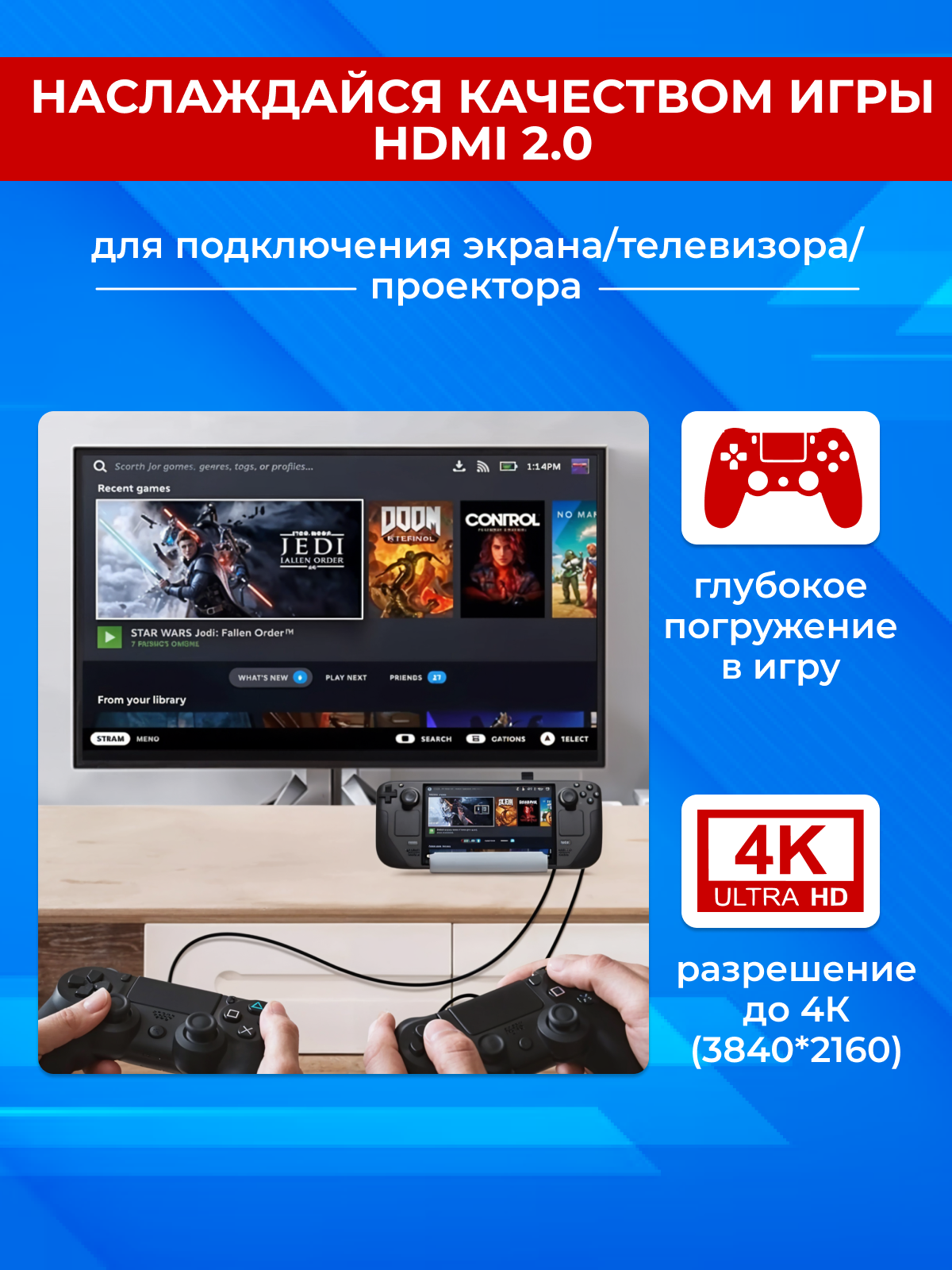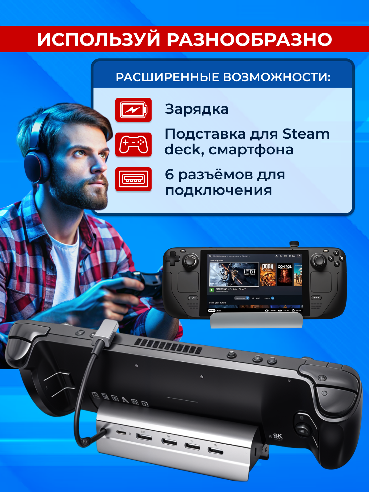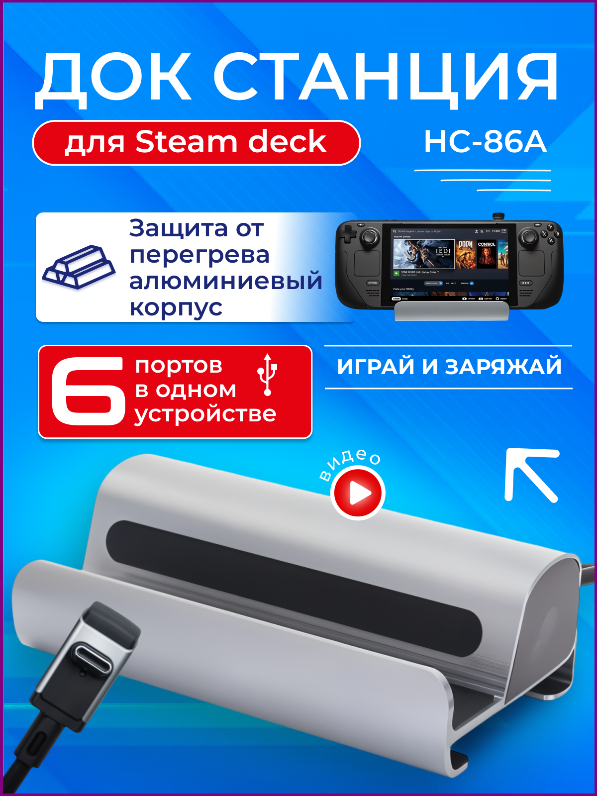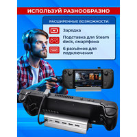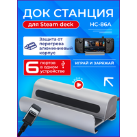 Steam Deck док станция 6в1 TAYMLUX HC-86A - это незаменимый аксессуар для каждого геймера. Этот многофункциональный девайс идеально подойдёт вне зависимости от того, где и как вы хотите использовать консоль: подключить её к телевизору в гостиной, установить на рабочем столе или поставить заряжаться на прикроватную тумбочку.