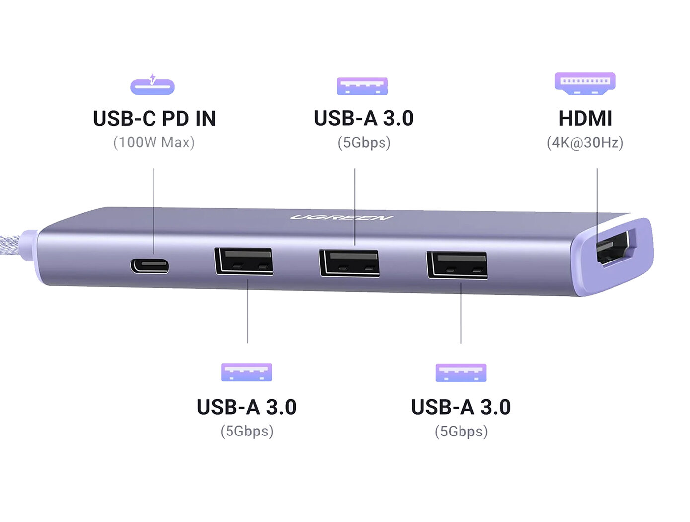 Док-станция/ USB-хаб UGREEN CM478 USB Type-C 3xUSB 3.0 Type-A USB Type-C HDMI 100Вт Фиолетовый 35582 35582: сравнение цен, характеристики, фото, актуальное наличие и цены.