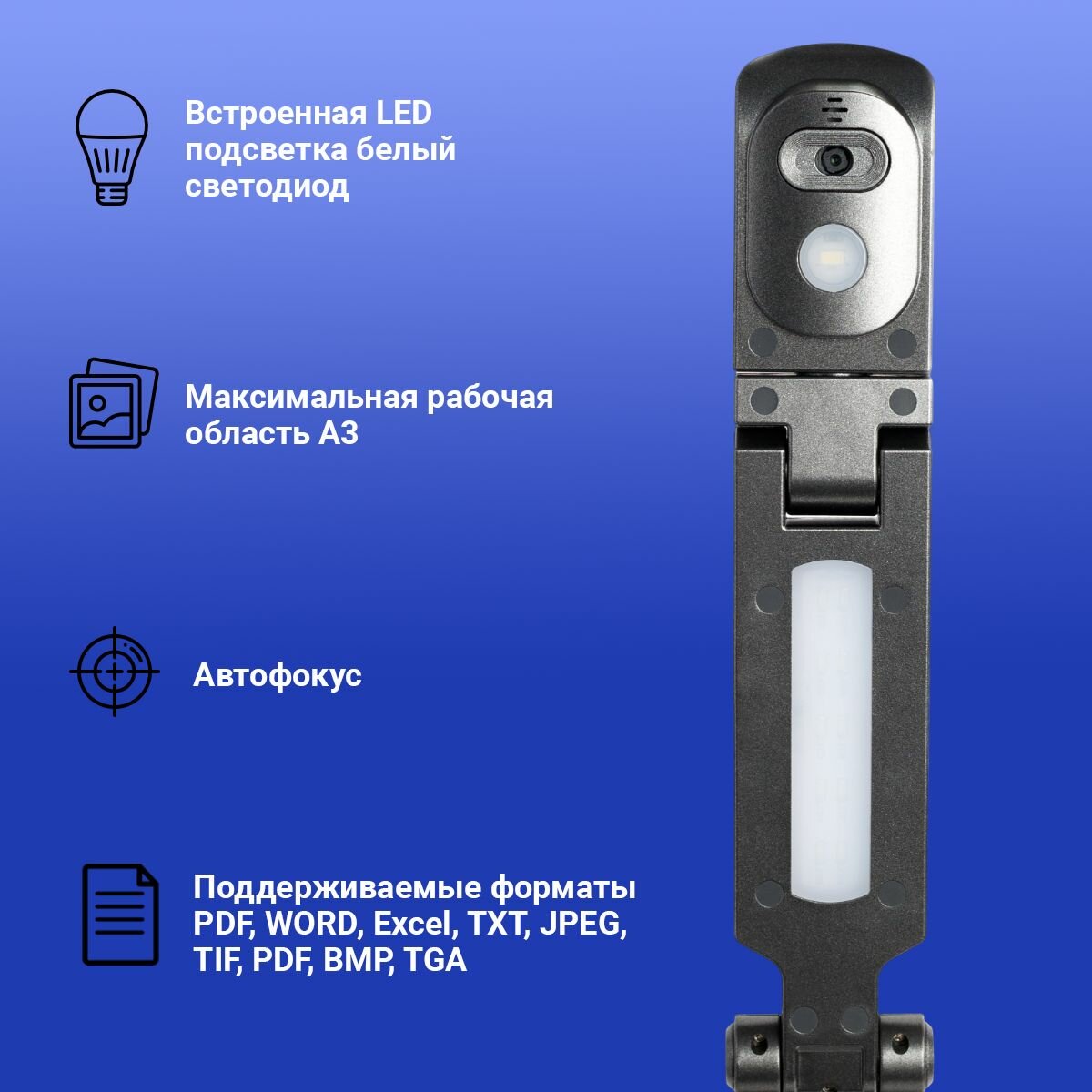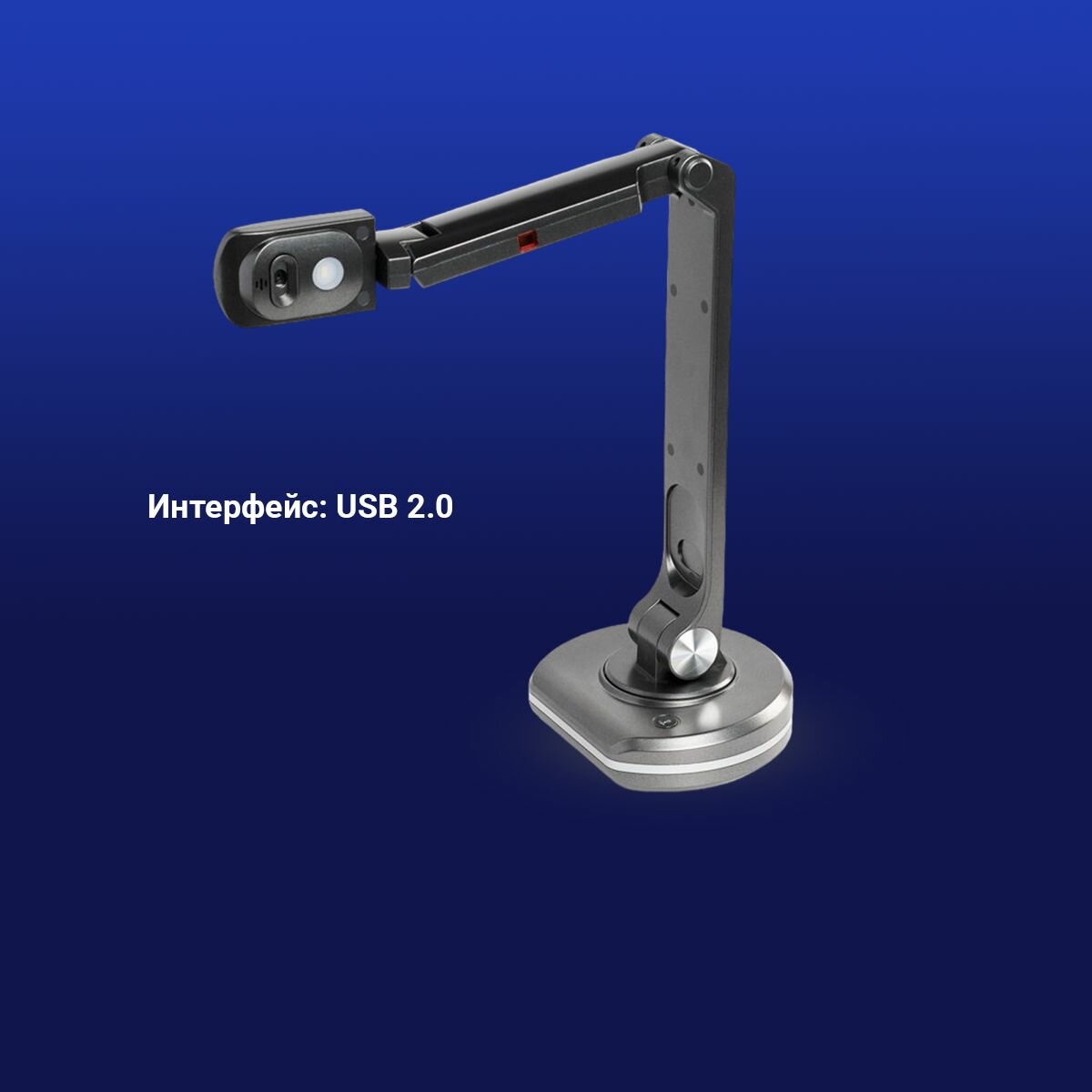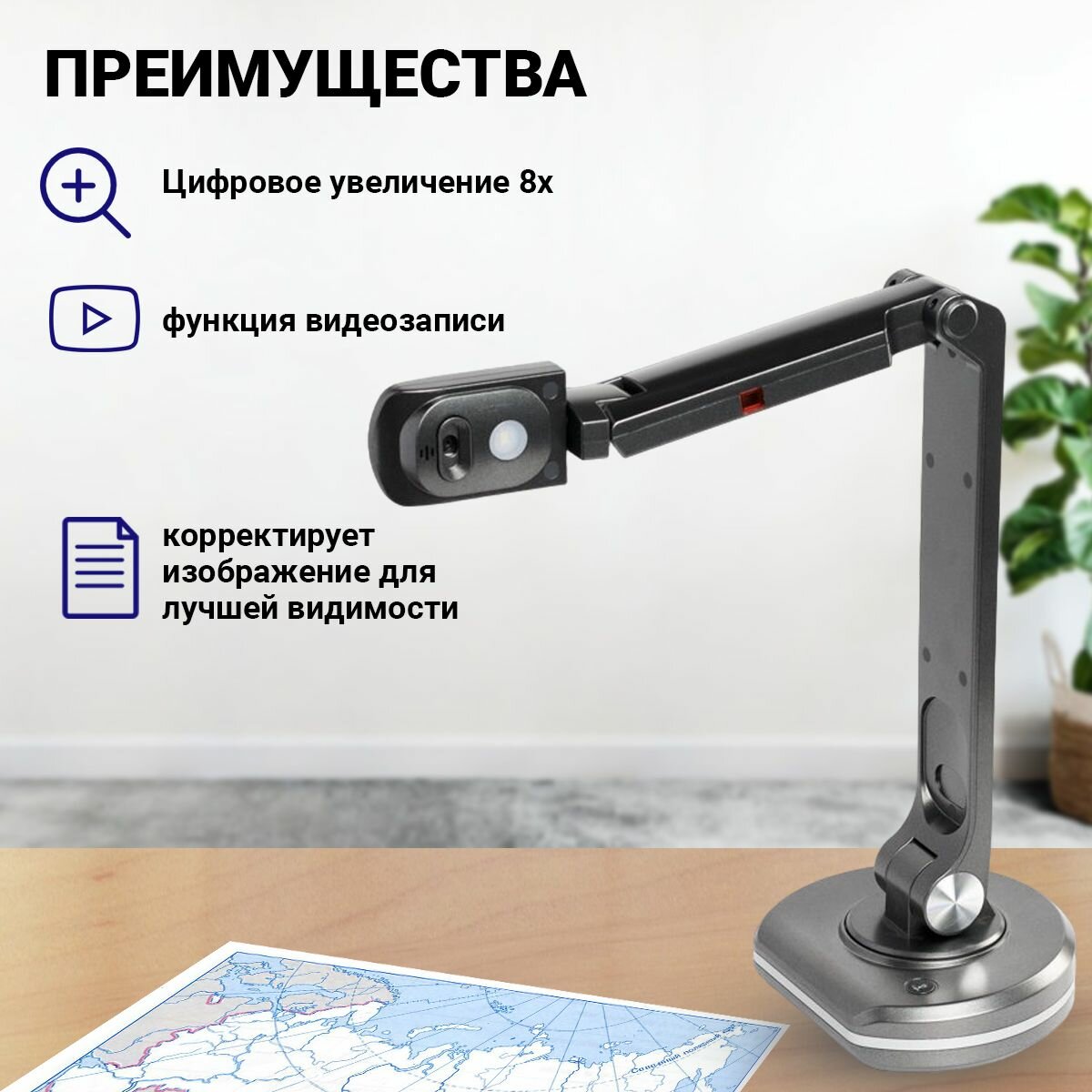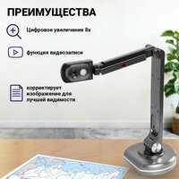 Устройство имеет раздвижной штатив, который можно вращать и наклонять. Камера с сенсором высокой четкости обладает 8-мегапиксельным объективом. Для удобства присутствует функция видеозаписи. Яркая LED-подсветка обеспечит отличную видимость объекта даже при недостаточном освещении помещения. Для приближения отдельных фрагментов предусмотрен цифровой зум. Прибор автоматически сканирует предмет и корректирует изображение для лучшей видимости. Синхронизация устройства с компьютером осуществляется через встроенный USB-порт. Дополнительно в комплекте предусмотрено лицензионное программное обеспечение, с помощью которого можно осуществлять запись презентации и превращать обычные книги в электронные.
