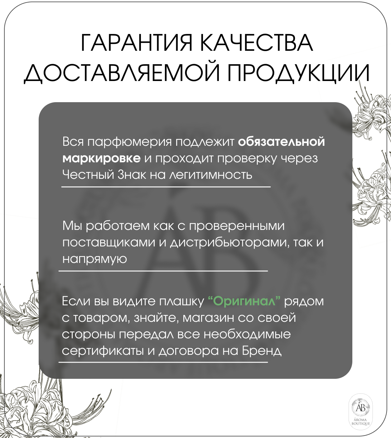 Произведенный в Италии, этот элитный парфюм относится к классу «люкс» и прошел строгую процедуру оценки соответствия требованиям Технического регламента, что подтверждает его высокое качество. Храните его в сухом и темном месте, подальше от отопительных приборов, чтобы наслаждаться его уникальным ароматом на протяжении 36 месяцев.