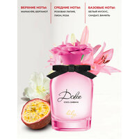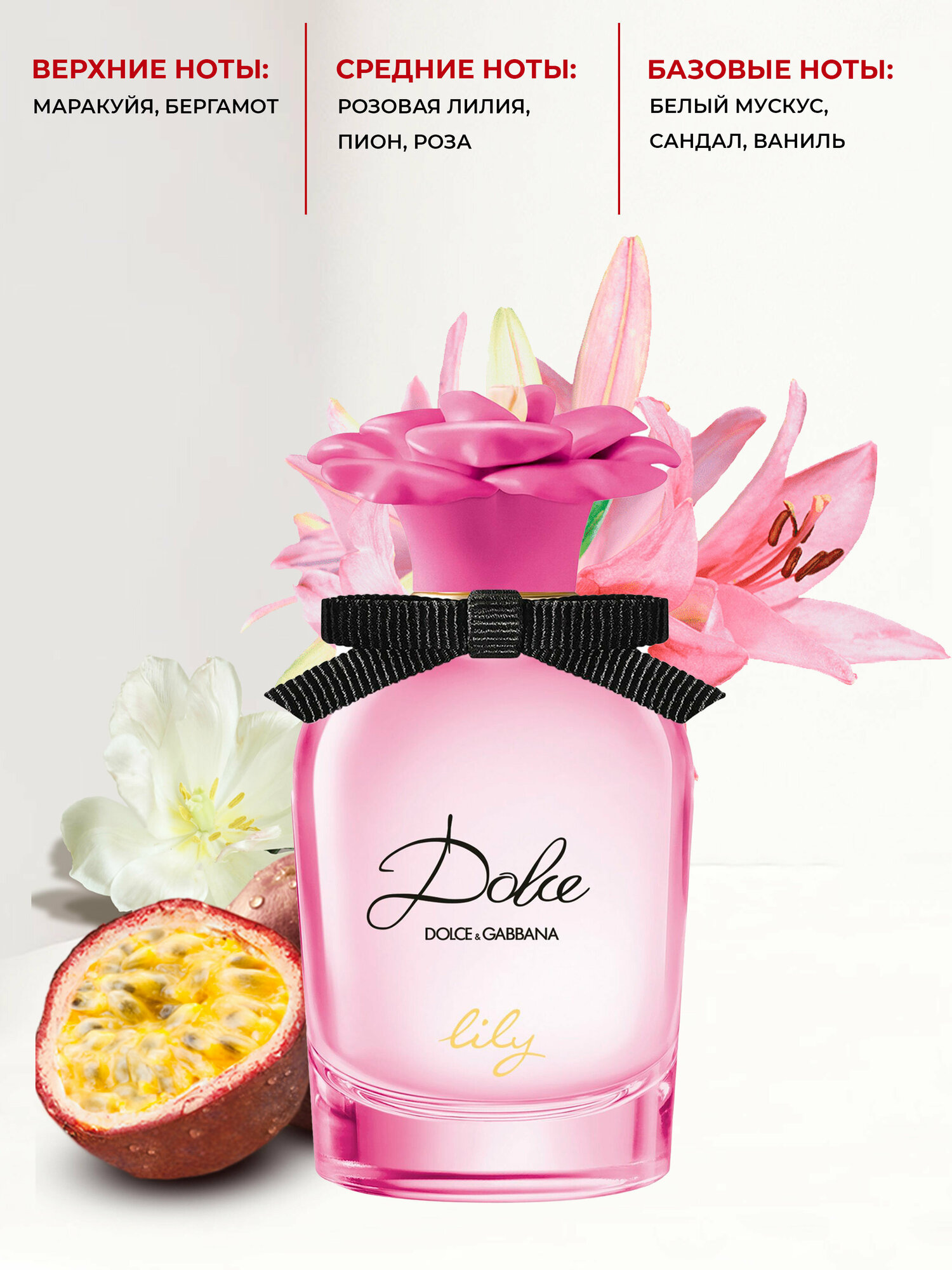Искрящийся и жизнерадостный цветочно-фруктовый аромат воплощает искренность, отзывчивость и превращение юной девушки в уверенную в себе молодую женщину. Всегда оставаясь в движении, она умеет наслаждаться простыми радостями жизни, и ее неповторимый характер и энергетику идеально отражает яркая композиция Dolce Lily. Композиция открывается яркими фруктовыми нотами: цитрусовая пикантность итальянского бергамота контрастирует с экзотическим акцентом маракуйи. Аккорд маракуйи привносит тропические оттенки в сердце композиции, где ослепительные акценты розовой лилии переплетаются с утонченным звучанием розы. Эти сверкающие цветочные ноты раскрываются на фоне нежных мускусных, которые придают парфюму ненавязчивую чувственность. Сандал делает шлейф более стойким и насыщенным, а ваниль оставляет на коже притягательный аромат.