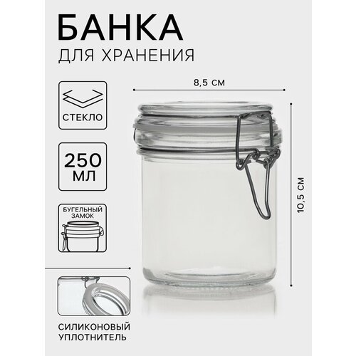Банка стеклянная для сыпучих продуктов с бугельным замком «Галерея» — благодаря стильному дизайну и надёжному бугельному замку, эта банка станет прекрасным дополнением к вашей кухне. Прозрачное стекло позволяет видеть содержимое банки, сохраняя свежесть и качество продуктов. Бугельный замок плотно прижимает крышку к горлышку банки, обеспечивая герметичность и предотвращая попадание пыли и влаги внутрь. Идеально подходит для хранения и подачи различных продуктов: от специй и чая до печенья и конфет. Её также можно использовать для хранения мелочей, фурнитуры или бижутерии. Компактный размер и удобная форма банки делают её удобной для использования и хранения. Банка легко моется и прослужит вам долгое время.