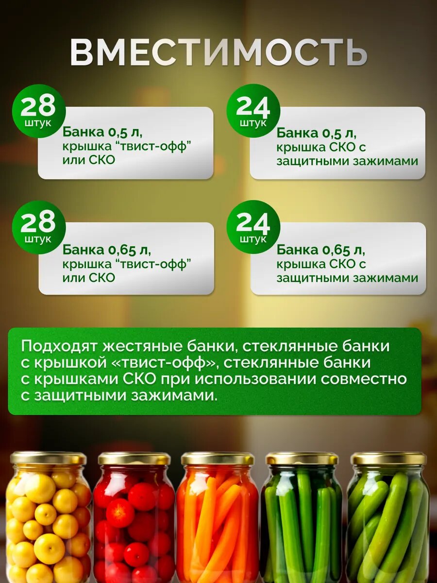 Эффективный автоклав обеспечивает автоматическую консервацию, что значительно упрощает процесс приготовления домашних заготовок, таких как тушенка или варенья. С ним вы сможете без труда сохранять свежесть и вкус домашних продуктов, которые порадуют вас в любое время года. Специальная конструкция аппарата для консервирования позволяет предотвратить перегрев и гарантирует максимальную безопасность во время использования.