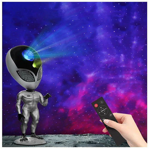 Пришелец прибыл в вашу квартиру, чтобы подружиться и озарить стены невероятными космическими огнями! Уникальный лазерный ночник проектор звёздного неба «Инопланетянин» - это - отличный декор комнаты, - интересная для ребёнка фигурка игрушка, - мощный светильник проекция космических туманностей и звездного неба, - ночник с подсветкой глаз, - «повторюшка»: в режиме голоса он записывает вашу речь и повторяет ее. Домашний лазерный проектор мощнее обычных светодиодных проекторов, а значит изображение, исходящее из головы нашего «Инопланетянина» будет ярче, чётче, мощнее. Регулируйте положение головы пришельца и направляйте свет, куда вам нужно, все настраивается под ваши предпочтения. Проекция космической туманности и звёзд управляется как с пульта, так и с кнопок на самом светильнике звёздного неба. Вы сами устанавливаете яркость, скорость движения, динамическое или статическое движение. В комплекте идёт пульт, который позволяет вам управлять RGB проектором «Инопланетянин» не вставая с места, что очень удобно, если вы хотите поменять режимы. Лазерный звёздный проектор служит также ночником. Вы можете оставить включёнными только глаза Инопланетянина, которые мягко будут подсвечиваться в темноте. Спать вы будете под защитой вашего маленького друга. Уникальный дизайн проектора подойдёт как комнате ребёнка, подростка, так и комнате взрослого человека, интересующегося фантастикой или просто вдохновленного необычной формой светильника. Поверьте, ваши гости с восторгом будут спрашивать, что же стоит у вас на полке! Таймер отключения будет удобен, если вы хотите уснуть в окружении космических туманностей. Установите время на 1 час или на 2 часа, и Инопланетянин сам отключится. Весёлая функция управления голосом. Включите эту функцию, и Инопланетянин будет повторять любые звуки, которые вы произносите. Появляется ощущение, что маленький пришелец разговаривает с вами. Отзывы покупателей доказывают, что такой светильник всегда будет в центре внимания на вашей вечеринке, украсит уютный вечер за просмотром фильма, восхитит детей и взрослых, станет весёлым ночником, забавой с повторением голоса, будет отличным фоном ваших видео и фото. Равнодушных нет! Внимание! Ознакомьтесь с инструкцией в коробке, чтобы обеспечить правильное безопасное использование лазерного проектора звёздного неба.