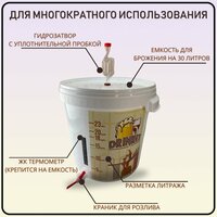 Домашняя пивоварня Drinkit Лидер – качественное оборудование для приготовления пива в домашних условиях. Мы комплектуем нашу пивоварню российским солодовым концентратом премиального качества. Домашняя пивоварня Дринкит Лидер для приготовления нефильтрованного пива – залог успеха вашего напитка у всех, кто его дегустирует. В Домашней пивоварне есть все необходимое, чтобы приготовить любимый напиток. Загляните в инструкцию и вы удивитесь – пиво в домашних условиях – это просто и доступно. Вам откроется мир любимых вкусов и безграничность возможностей экспериментов с сортами! В комплект Домашней пивоварни входит: • Емкость для брожения 30л – 1 шт. • Гидрозатвор с уплотнительным кольцом – 1 шт. • ЖК термометр – 1 шт. • Краник для розлива пива по бутылкам – 1 шт. • Ложка-мешалка 50 см – 1 шт. • Солодовый экстракт – 1 шт. • Средство для дезинфекции оборудования и бутылок – 2 шт. • Пакетик с пивными дрожжами – 1 шт. • Декстроза – 0,25 кг